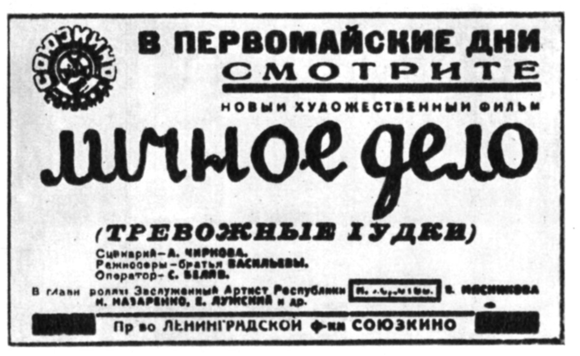 ‹…› не сохранился фильм братьев Васильевых «Личное дело» — одно из немногих произведений, посвященное выдвинутой первой пятилеткой рабочей ‹…›. В творческой биографии братьев Васильевых он непосредственно предшествовал «Чапаеву» ‹…›.