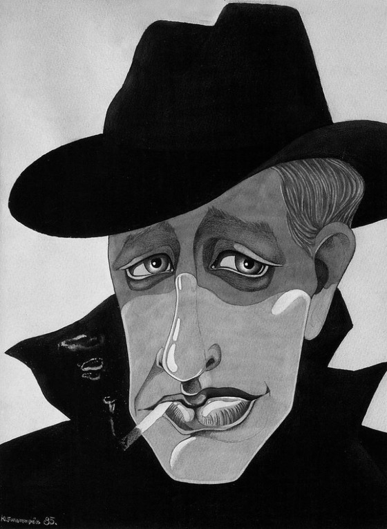 И обязательно надо знать, что на этом рисунке — Инна Чурикова в фильме Г. Панфилова «Валентина», а на том — Евстигнеев в роли Сатина из постановки «Современника» «На дне». Это надо знать не для того, чтобы узнать знакомые лица, а для того, чтобы острее и глубже ощутить образ, неповторимую характерность артиста; эти рисунки — своеобразные изобразительные эссе. Их можно, условно, конечно, и приблизительно, перевести на литературный язык. Грубо говоря, — описать. Описать землистое, синеватое, испитое лицо Сатина (Евстигнеева) с мятым окурком на лиловатой отвислой губе, в жалкой, мятой шляпенке набекрень... в белой, словно больничной, рубахе на сутулых плечах — краска положена грубовато, будто небрежно, блеклыми желтоватыми мазками, пятнами, линия размыта, невнятна (это даже не очень характерно для тщательной прописной манеры художника). Лишь голубые зрачки — словно из другого бытия — светятся на изможденном безжизненном лице молодым, умным и добрым блеском. Да, поистине это маленькая рецензия на игру Евстигнеева в том спектакле. И Чурикова, страшная и прекрасная, монументом закаменевшая за буфетной стойкой с бутылкой кефира в руке, сразу вызывает в памяти ту высокую трагедийную ноту, которая всегда звучит с ее появлением на экране. Такого кадра нет в картине: актриса, помнится, но принимала подобных поз, буфет, на фоне которого она изображена, мало похож своими готическими очертаниями и цветом на то, кто мы видели в фильме. Художник не стремится к полной узнаваемости, он пытается изобразить — в какой-то степени метафорически — высший смысл образного решения.
