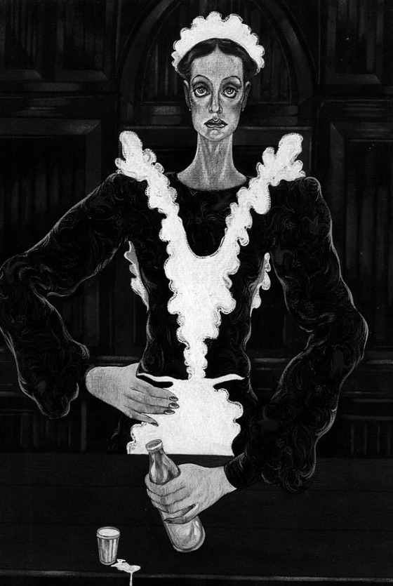 Его рисунки работают в полную силу лишь тогда, когда знаешь — зачем они, к чему и отчего. Когда знаешь: это вот А. Вертинская и С. Любшин в «Тартюфе» А. Эфроса во МХАТе. Любшина не сразу даже и замечаешь — все пространство занято ослепительно прекрасной рыжеволосой женщиной, ее огненным платьем павлиньих цветов, пеной изящных кружев, тонкими руками, как-то странно, испуганно и удивленно прижатыми к платью, ножками в розовых башмачках с бантами, — и вдруг как-то внезапно открываешь причину ее напряженной, слегка встревоженной позы. Над ее головкой, как неживая маска мертвенно-серого цвета, нависает худое лицо, обрамленное пепельными волосами. Это Тартюф (Любшин). Он смотрит на нас, словно не замечает Эльмиры, меж тем как руки его (их примечаешь в самую последнюю очередь), огромные, зеленовато-серые, извилистые и грубые одновременно, уже обхватили, обняли, впились в тело желанной женщины... В этой картинке — точная зарисовка сценических образов, их отношений, их тайной и явной игры, их пластической характерности: огненно-пылкая, обжигающе великолепная, победительная Эльмира и тонкий, неприметный, вкрадчивый иезуит — серый кардинал в сером обличье. Этот рисунок, наверное, хорош и сам по себе, но куда больше он впечатляет, когда возвращаешься памятью к спектаклю и его исполнителям.