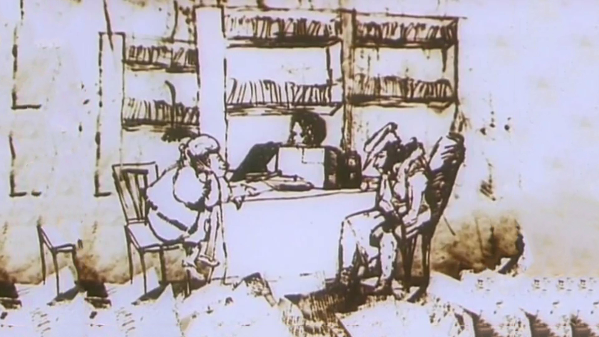 В «Истории одного преступления» мы искали, кроме того, детали, более лапидарное движение — то, что сейчас называют лимитированной, упрощенной анимацией. Но она тем более требует таких вот непроизвольных деталей: Василий Васильевич подходит к телевизору и садится с чашечкой чая. Но прежде чем сесть, он на минуточку оглядывается на стул, на который он должен сесть. Это сделано не в стиле классической анимации, без свойственного ей множества подробностей, которые в данном случае просто отсекаются, все сделано более общими мазками. Но вот эта деталь важна. ‹…›