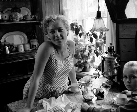 Г.Р.: Сначала выбраны точные фактуры, затем кадр естественно освещен. Если есть задание точное, то его стараешься точно и выполнять. Взять «Асю-хромоножку». В решении там много черного и сверкающего белого. Опять скажу: сущность диктует эстетику. Эстетика стоит на службе первой, ее достаточно определить. А дальше должна существовать некая натренированность, профессиональное умение. Причем одни объекты хороши в цвете, а другие — в черно-белом изображении. Если картина цветная, то ряд объектов ты неизбежно теряешь. В «Асе-хромоножке» я люблю рабочие столовые, и избушки, а главное — лица людей. Естественно, дома с потертыми фактурами, с потертой стенкой, одно подкрашено, другое лупится. Это интересно. Но когда человек закинут в однокомнатную типовую квартиру на окраине и это надо снимать, то ясно, что делать там нечего. Опасен стандарт.