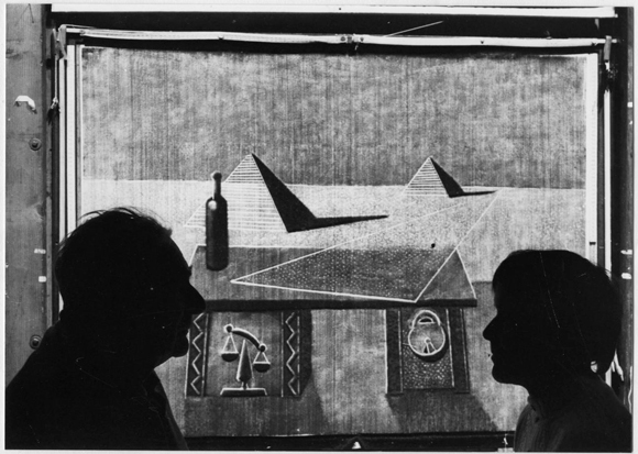 Белый фон образован белой вертикальной обрамленной пластиной, освещенной единственным источником света под углом к ее лицевой поверхности. Так же освещена черная плоскость. Пластина просверлена насквозь перпендикулярно к ее плоскостям: в крошечных отверстиях свободно скользит соответствующее количество иголок. Длина иголок несколько больше толщины пластины, так что, если их вдвинуть до уровня лицевой поверхности, они покажутся с другой стороны, и наоборот. В первом случае лицевая поверхность — белая. Если теперь одну из иголок выдвинуть вперед, на белой поверхности образуется ее тень. Чем дальше продвинется иголка, тем длиннее будет ее тень. Если теперь группу иголок выдвинуть вперед до максимума, тень каждой иголки достигнет соседней тени, и участок белой плоскости за этой группой иголок не получит освещения и покажется черным. Если эту группу иголок вдвинуть в экран, скажем, наполовину, тени станут вполовину короче, между ними возникнут крошечные белые участки, и мы получим эффект среднего серого тона.