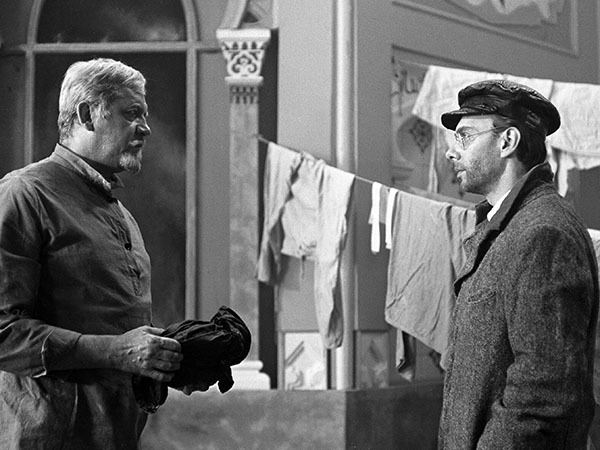 С той самой минуты, когда мы впервые видим его, возвышающегося над толпой арестованных деятелей царской власти, возвышающегося не только потому, что он просто ростом выше других, а благодаря тому особому внутреннему превосходству — души и мысли, которое сразу же невидимой, но резкой чертой отделяет его от окружающих, — с той самой минуты и до конца фильма он ни на секунду не отпускает нашего напряженного внимания. Полный благородного достоинства, высокой человечности и немного скорбной мудрости, он проходит через весь фильм фигурой масштабной и величественной, человеком подлинно трагической судьбы.