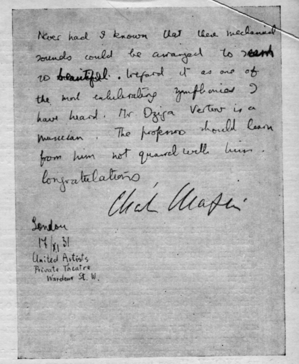 [29] Чарли Чаплин передал Вертову через Айвора Монтегю письмо, в котором содержалась восторженная оценка фильма «Симфония Донбасса (Энтузиазм)»