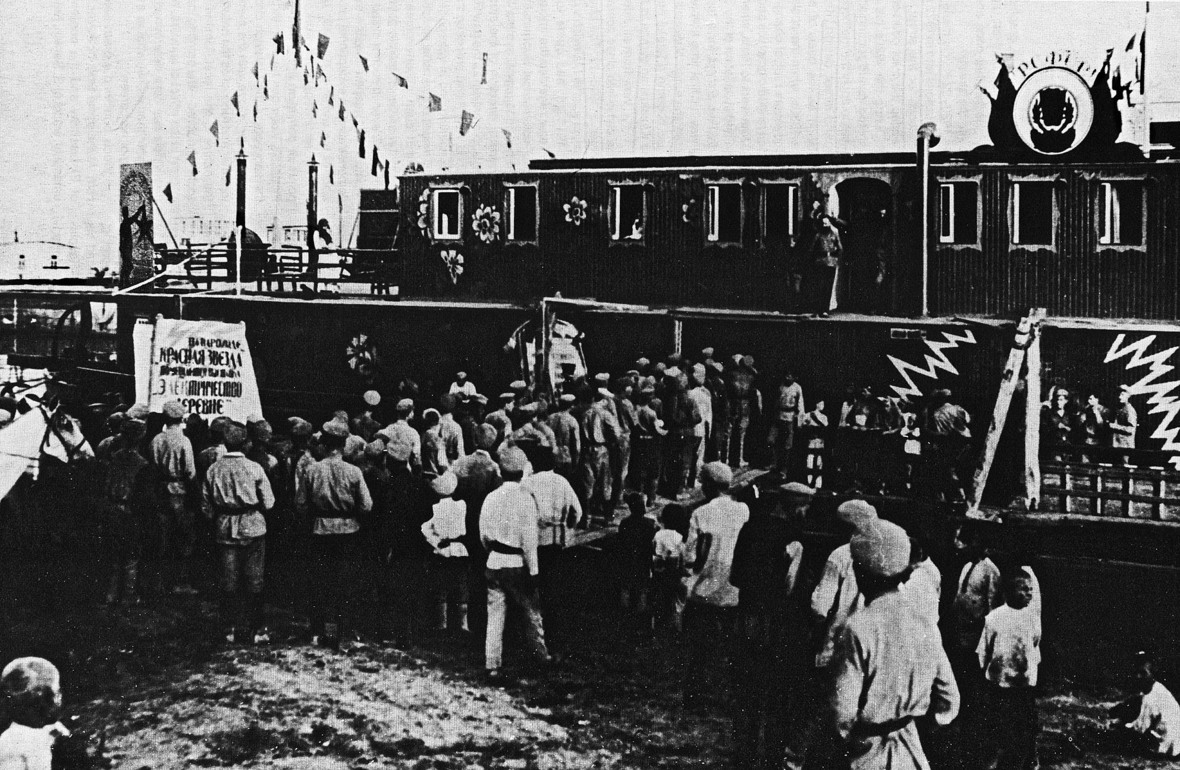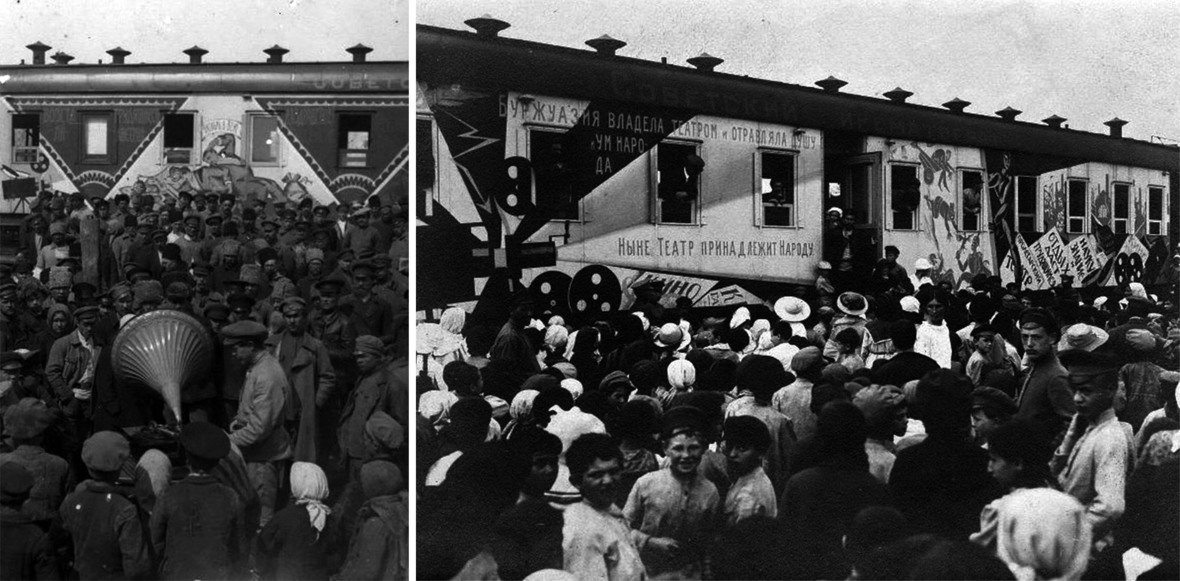 им. Ленина с киноустановкой. Ярко оформленные поезда, приспособленные для кинопоказов, чтения лекций и выступлений, совершали систематические рейсы в прифронтовые районы, в отдаленные области республики. Сеансы проводились либо в киновагонах, либо прямо под открытым небом. Многие из зрителей впервые знакомились с кинематографом.