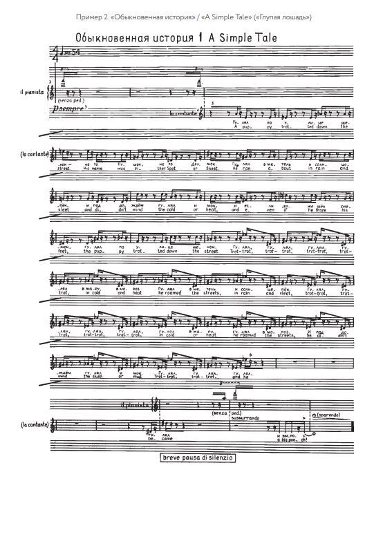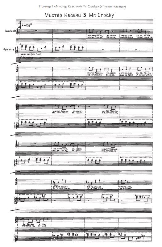 Если бы все звукоточки не образовывали континуальной линии, текстуру «Да» можно было бы назвать пуантилистической — настолько самоценен в ней каждый высотный пункт. Интервальный состав монодии, периодически меняющей свой тембровый колорит, ограничен использованием совершенных консонансов (единичные исключения лишь подчеркивают общий принцип), в чем и заключается логика мелодического развертывания. Отсутствие в интонационном запасе ассоциативно нагруженных элементов — специфическая черта музыки Кнайфеля, которая тоже осмысливалась исследователем в компаративном ключе: «Интонационная чистота, отстраненность от музыкальной “повседневности” сближает его с Ксенакисом или Булезом, аскетическое самоограничение и внутренняя “литургичность” творчества — с Пяртом». Сходный с «Да» интервальный вектор присутствует в сочинениях, написанных композитором в иных жанровых формах. Таковы, например, пьесы «Обыкновенная история» (№ 1) и «Мистер Квакли» (№ 3) из цикла «Глупая лошадь. Пятнадцать историй для певицы и пианиста» (1981). Мелодии в них складываются из коротких, главным образом квартоквинтовых мотивов, однако если в «Мистере Квакли» звуковая коллекция в основном не выходит за пределы диатоники (пример 1), то в «Обыкновенной истории» (пример 2) она сразу значительно расширена благодаря хроматике. Рассмотрим способы организации отдельных музыкальных параметров, взятых в относительной изоляции. Высотное пространство «Да» неоднородно: в нем можно выделить 12 разделов, или зон. Критерием для их разграничения, притом что фактура абсолютно континуальна, служит периодичность воспроизведения начального построения (такты 1–7; пример 3). Маркированное с обеих сторон квартовыми «интервальными сигналами», оно в своем исходном виде основано на трех звуках — сis, fis, gis. Дальнейшее воспроизведение начального построения сопровождается постепенным обновлением звуковой коллекции. В появлении новых элементов прослеживается определенная закономерность, которая становится особенно наглядной, если объединить звуки в трехэлементные группы (субсеты). Общий звуковысотный план композиции (схема 1) в этом случае будет выглядеть так (субсет a, d, e, включающий буквы, входящие в название композиции, выделен жирным шрифтом):