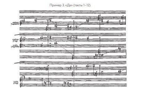 При помощи таких определений Эйхенбаума, как «лаконизм», «скупая речь», «интенсивность и энергия выражения» (если понимать под этим не открытую экспрессию, а, скорее, максимальную степень внутренней концентрации), может быть охарактеризован и представленный в «Да» композиторский идиолект. В проведенных аналогиях, не предполагающих, безусловно, прямого уподобления словесного языка музыкальному, и состоит оправдание переноса литературоведческого подхода на область музыкальных явлений. Сформулируем предварительные вопросы. Как устроена звуковая материя «Да»? Является ли она результатом продуманной системы взаимосвязей («осторожной, обдуманной мозаикой») или же существует независимо от нее? Что собой представляют конструктивные принципы этого художественного текста? Каковы, наконец, конкретные связи и отношения между элементами? Крайний лаконизм выразительных средств — высотных, ритмических, артикуляционных, динамических — не оставляет места «безудержному потоку слов», аналогом которого могли бы служить плотность звуковых событий и текстурная насыщенность. Музыкальная ткань в «Да», напротив, предельно проста и в основном сведена к одноголосной линии, лишенной какой бы то ни было декоративности, что позволяет воспринять кристальную ясность каждого звука и тончайшие оттенки тембровых переходов. Простой рисунок мелодии складывается по преимуществу из интервалов, образующих начало обертонового звукоряда (октава, квинта, кварта); в одном из них, по-видимому, нашло свое символическое воплощение название сочинения: «сопряжение-согласие (“да”) звуков (d–a) <…>это род манифеста, утверждающего идею двуединства». Художественный образ, явленный в звучностях, словно парящих в недосягаемо-высоком регистре, может быть передан на языке возвышенных религиозных символов и отнесен к первичным — онтологическим — моделям (терминология А. Ф. Лосева).