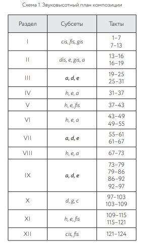 На представленной схеме хорошо видно, что звуки в субсетах (за исключением второго) находятся друг с другом в кварто-квинтовых отношениях. Расположение самих субсетов — а это следующий, иерархически более высокий уровень организации, — примечательно несколькими внутренними арками: одна из них переброшена от начала к финальным тактам композиции (разделы I и XII), несколько других образуются между тождественными друг другу субсетами (разделы IV, VI и VIII; V и XI; III, VII и IX). Данными закономерностями, впрочем, логика высотного развития не исчерпывается. Порядок, в котором звуки впервые появляются в композиции, тоже демонстрирует возможность их попарного объединения по кварто-квинтовому принципу: cis–fis, gis–dis, e–a, a–d, е–h, d–g, g–c. Как видно, для достижения двенадцатизвукового сета недостает одной пары звуков — f–b. Принцип постепенного развертывания звуковысотного пространства в «Да» можно назвать пошаговым, если воспользоваться удачным определением Валентина Сильвестрова, представленным в его книге «Дождаться музыки»: «У Кнайфеля тоже пошаговая композиция, но в этой композиции есть невероятные вещи: там слух актуальный, все интервалы добыты»