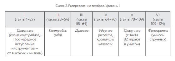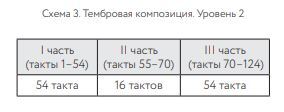 В свою очередь, слова Александра Кнайфеля, некогда сказанные в адрес коллеги, удивительно точно характеризуют и его собственный метод сочинения: «Мой друг Валентин Сильвестров просто и замечательно сформулировал проблему в двух словах: “Ведь сколько надо потратить сил, чтобы найти одну-единственно верную ноту! И это еще не все, надо найти вторую!”». Не будет преувеличением сказать, что такой же трудный поиск верной ноты, аналогичный поиску juste mot — верного слова — в вербальном высказывании, ощутим в становлении звуковысотного пространства «Да». Тембровый параметр раскрывает структуру композиции иначе, чем высотный; причем в нем также можно выделить самостоятельные уровни формы — второго и даже третьего плана. На схеме 2 представлены шесть разделов, индивидуализированных с точки зрения как масштаба, так и тембрового воплощения. Единственный во всем сочинении монотембральный II раздел представлен контрабасовыми флажолетами — тончайшей краской, органично вписывающейся в общую палитру произведения, и единственным способом игры на струнных, задействованным в нем. Соло контрабаса, относительно крупное в масштабах сочинения, выделяется в структуре целого, что особенно заметно в сравнении с другими монотембральными фрагментами, продолжительность которых, напротив, поражает своим лаконизмом. Речь идет о чрезвычайно коротких, до предела сжатых звуковых событиях, — например, дуэте челесты и клавесина (такты 65–66) величиной в полтора такта. Клавесин вступает ради исполнения всего двух (!) нот, и этим объемом его партия в произведении и ограничивается. Аналогичный микромасштаб событий, не превышающий пары звуков, встречается в партиях и некоторых других инструментов — кларнета-пикколо (такты 56–57), блокфлейты-сопранино (такты 59–60), саксофона-сопранино (такты 62–63). Все разделы композиции — политембровые и монотембровые — обладают индивидуальным профилем. Окрашенный тембром струнных раздел I (схема 2) примечателен отсутствием контрабаса, который солирует в следующем разделе, становясь логическим продолжением тембровой модуляции от высоких струнных к низким. Возвращаясь в финале (схема 2, раздел VI) к первоначальному инструментальному составу, композитор качественно трансформирует звучание струнных. Оно приобретает «неосязаемый», надмирный характер благодаря тому, что политембровый унисон — фактурный принцип, допускающий ассоциации со средневековой хоровой монодией, — проходит через своеобразный акустический фильтр (звукозапись). Подчиняется ли тембровое развитие в композиции неким структурным принципам? Ответ на этот вопрос не может быть получен без детального анализа и установления соотношений между частями и целым. Мастерство, с каким автор управляет процессом непрерывного изменения колорита, поистине изумляет: за плавностью тембровых переходов обнаруживаются конструкции с идеально выверенными пропорциями. Величина центральной части (схема 3, II часть) находится в математически точном отношении (1: 3) к масштабу обрамляющих частей. Симметрия композиции подчеркивается и распределением тембровых ресурсов: струнные расположены в крайних частях (I часть, такты 1–54; III часть, такты 70–124), духовые и ударные — в центре (такты 55–70):