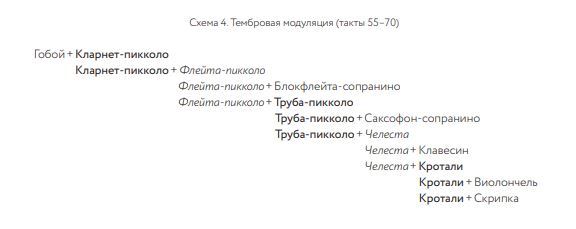Сопоставив два уровня тембровой композиции (схема 2 и схема 3), отметим, что в опорных точках их внутренние границы совпадают. Приблизившись к деталям, можно увидеть иные, более дифференцированные способы организации тембрики (схема 4). В целом тембровые модуляции, происходящие как внутри, так и на грани разделов, — важнейший, но не единственный прием развития в этом параметре. Тембровые миксты, возникающие в редкие моменты двухголосия (труба-пикколо и саксофон-сопранино в такте 62; кротали и виолончель в такте 68), — еще одна примечательная черта. Тембр, играющий в «Да» не только выразительную, но и формообразующую роль, будет рассмотрен далее в координации с другими уровнями организации — тематическим и высотным. Тематический уровень — особый срез композиции, структуру которого можно увидеть на схеме 1 (см. последний столбец). В чередовании равновеликих фрагментов, своего рода «шагах», и реализуется, на наш взгляд, принцип периодических повторений, позволяющий говорить о присутствии черт репетитивности в рабочем методе композитора. Начальное построение (звуки cis, fis и gis), функционирующее в качестве паттерна (пример 3), повторяется с небольшими изменениями в комбинации избранных тембров: скрипка+альт (такты 1–7), альт+виолончель (такты 7–13). Говоря об ансамбле альта и виолончели (такты 13–18), отметим редчайшие в данной композиции интервалы секунд — dis–e и gis–a, от которых перебрасывается арка к секундовому мотиву e–d в тактах 95– 96. Следующая пара построений (такты 19– 25 и такты 25–31) тембрально решена иначе: скрипка+виолончель, виолончель + альт. В образовании этих инструментальных дуэтов продолжает действовать «пошаговый» принцип, который соблюдался в начале композиции (такты 1–13): a+b, b+c. Контрабасовый раздел (схема 2), в свою очередь, делится на четыре подраздела, из которых первый (такты 31–37), третий (такты 43–49) и четвертый (такты 49–55) основаны на субсете h, e, a, и только второй (такты 37–43) — на субсете h, e, fis. Перенос паттерна на новый высотный уровень (единственное исключение в довольно стабильном с точки зрения звуковысотности разделе) не отменяет основной принцип развития тематического материала — точного или варьированного повторения исходной модели. В разделе III (схема 2), отмеченном появлением субсета a, d, e, вызывает особый интерес тембровое воплощение паттерна (такты 55–61; такты 61–67). Благодаря крайне детализированной технике, ассоциирующейся с искусством микромозаики, композитор темброво индивидуализирует каждый звук, создавая тем самым контраст к однородной краске в разделе контрабасового соло. Рассмотрев дифференцированную работу с тембром, можно заметить, что и она заключается в «пошаговом» переходе от одной комбинации инструментов к другой; не повторяющие друг друга ансамбли выстраиваются, подобно звеньям одной цепи, в единый континуум, плавно меняющий свой колорит (схема 4). Чередование тембровых красок регулируется локальным конструктивным принципом: инструменты, появляющиеся однократно (блокфлейта-сопранино, саксофон-сопранино, клавесин), располагаются в середине каждого крупного «звена», а инструменты, фигурирующие в нем трижды (флейта-пикколо, труба-пикколо, челеста, кротали), обеспечивают его связь с предыдущим и последующим звеньями политембровой цепи.