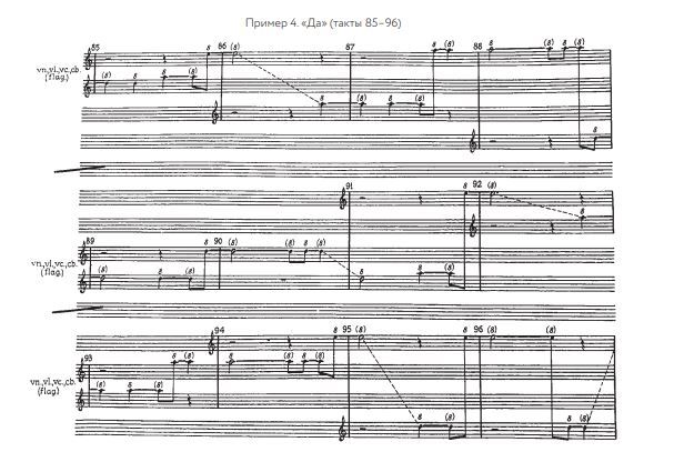Этот участок формы, основанный на градуированных «цветовых» переходах, располагается между двумя однородными с точки зрения тембра разделами: контрабасовым solo, с одной стороны, и унисоном струнных — с другой. Паттерн у струнных (схема 2, раздел V) представлен знаковым для данной композиции субсетом a, d, e (такт 73) и примечателен своим тембровым перевоплощением; при воспроизведении паттерна (такты 79– 86) возникает комбинация не двух разных инструментов, а одного и нескольких (скрипка + ансамбль струнных). Суммарная краска, символизирующая всеобщее, соборное звучание, подчеркивает кульминационную зону. Следуя принципу варьированного повторения, действующего, как мы наблюдали, в «Да» на разных уровнях организации, композитор в финале сочинения (такты 109–124) дает звучание струнных в двух вариантах: чистом и технологически преобразованном (фонограмма). Крайне детализированная работа со звуковым материалом наблюдается не только в тембровом параметре. Обратимся к разделам V и VI (схема 2), распадающимся на четыре подраздела, в каждом из которых представлены паттерн и его повторение: подраздел I (такты 73–79 и такты 79–86); подраздел II (такты 86–92 и такты 92–97); подраздел III (такты 97–103 и такты 103–109); подраздел IV (такты 109–115 и такты 115–121)