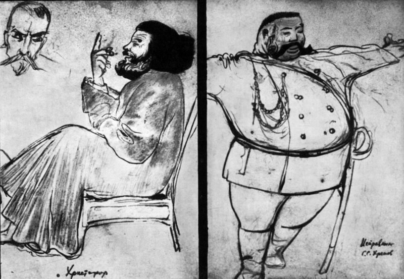 — Не знаю, о чьем приходе вы говорите, но я, во всяком случае, в ваш сад уже пришел! — раздался вдруг громкий хрипловатый голос из-за куста, вслед за чем появился и сам говорящий — козловский исправник Семен Семенович Хренов. Это был упитанный исправник ноздревского типа, лет пятидесяти, багрово-розовый, седой, весь пропитанный табачно-алкогольным духом, всегда нето полупьяный, нето полутрезвый, весельчак и балагур для знакомых и Каин для подчиненных.