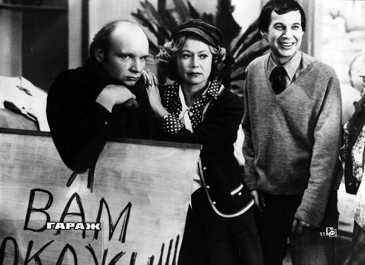 Андрей Мягков в роли лаборанта Семена Хвостова, Светлана Немоляева в роли жены Гуськова и Георгий Бурков в роли Виталия Фетисова в фильме «Гараж». Реж. Эльдар Рязанов. 1979