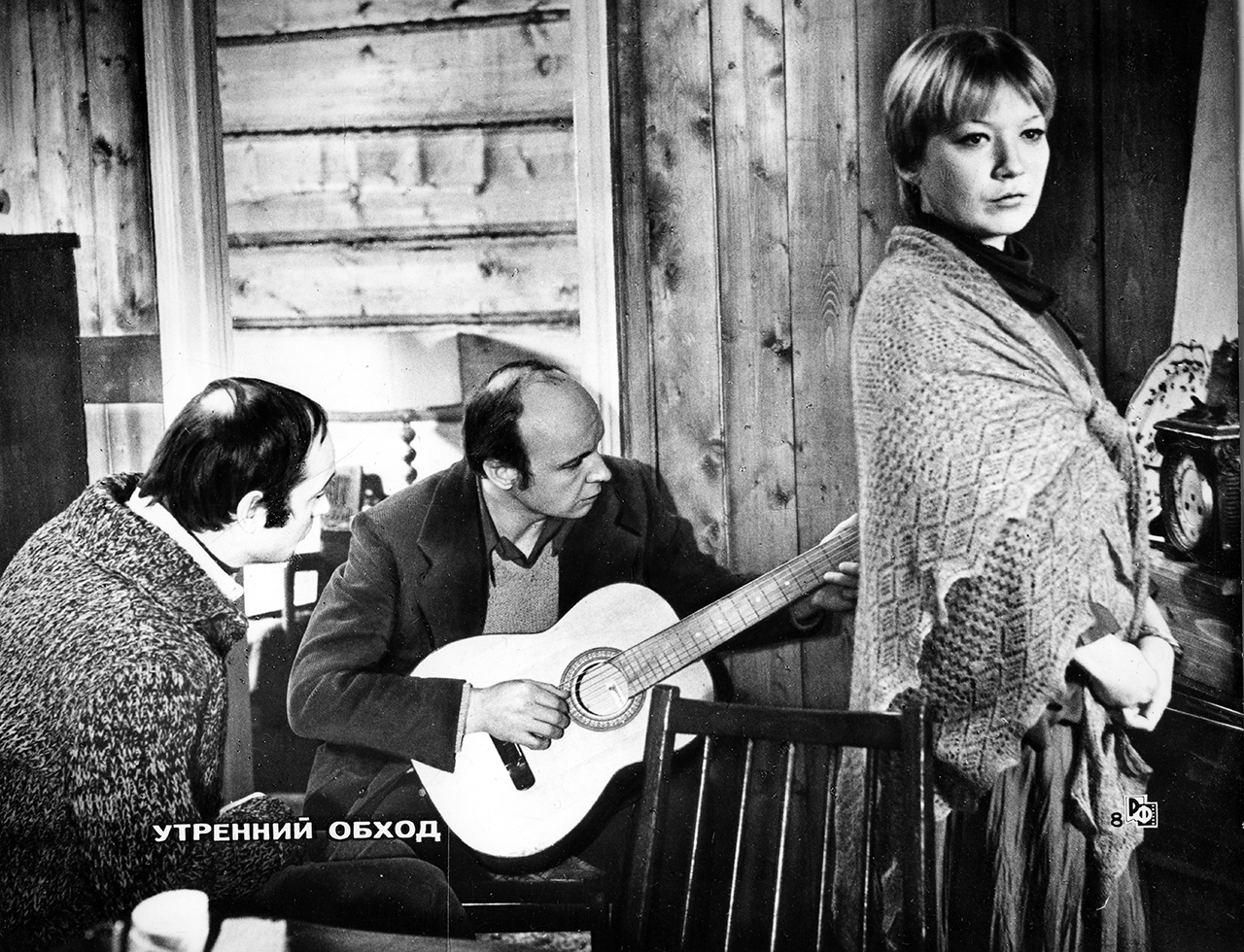 Валентин Гафт в роли барда Алика, Андрей Мягков в роли хирурга Льва Нечаева и Елена Коренева в роли студентки Али в фильме «Утренний обход». Реж. Аида Манасарова. 1980