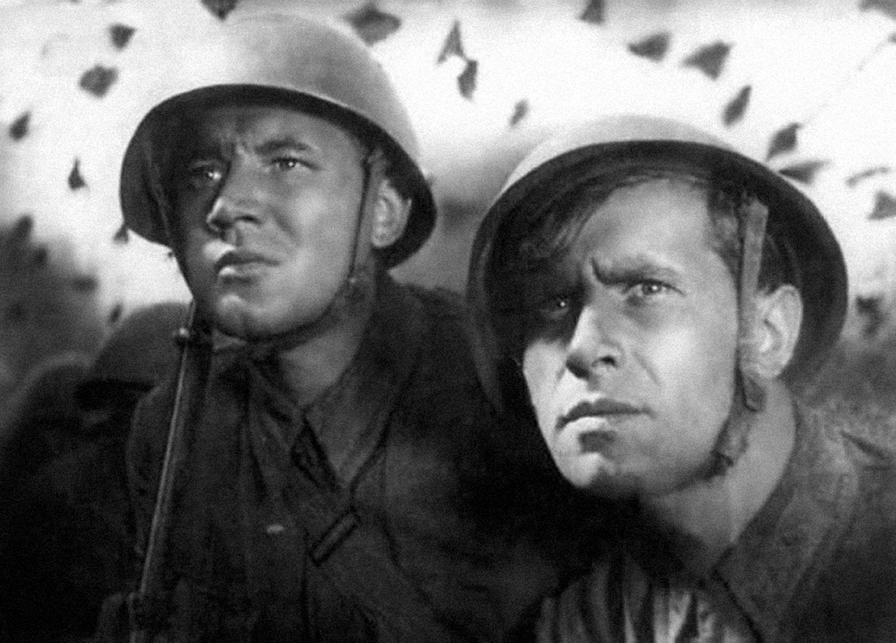 Борис Андреев в роли Саши Свинцова и Марк Бернес в роли Аркадия Дзюбина в фильме «Два бойца». Реж. Леонид Луков. 1943