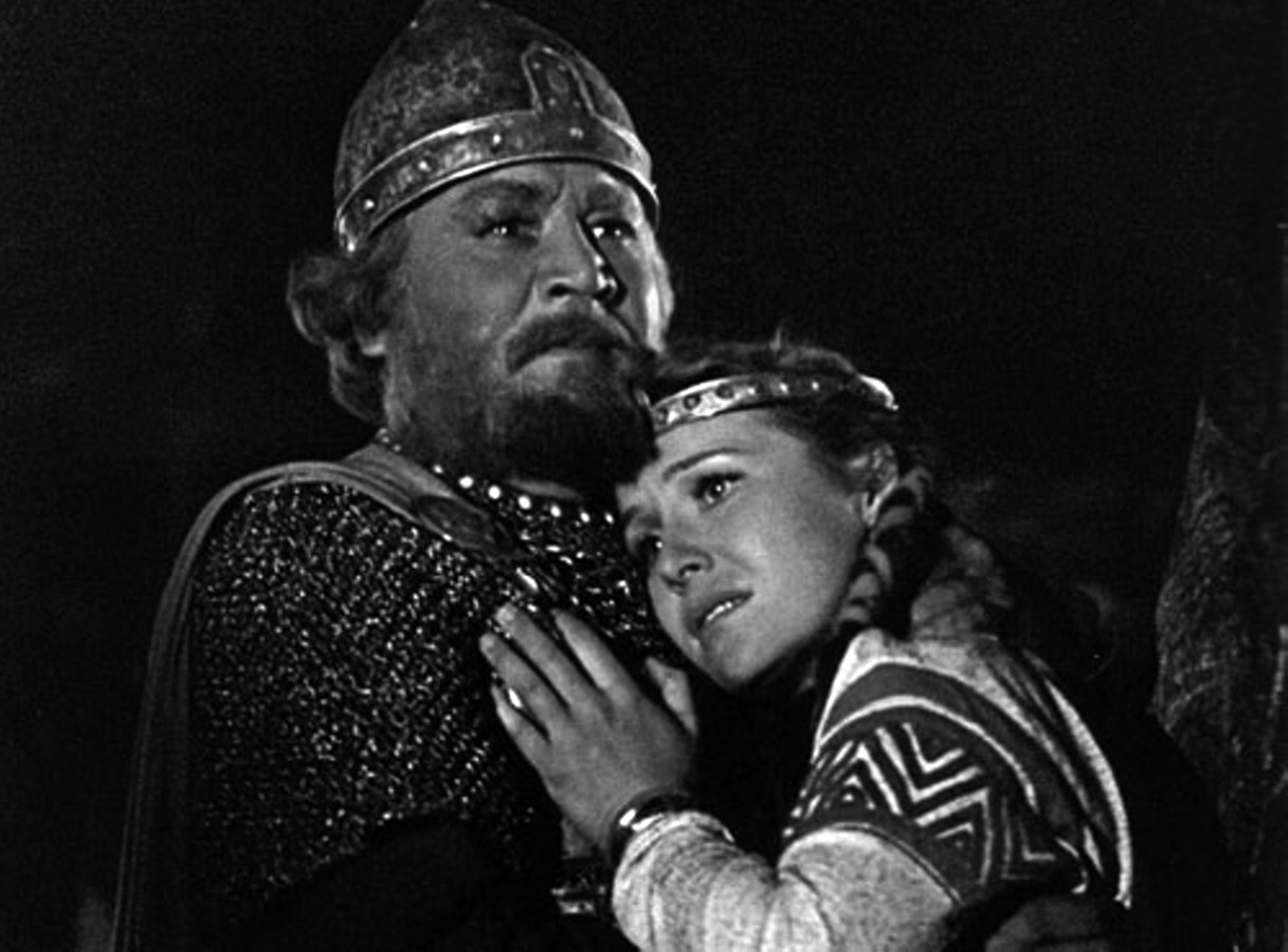 Борис Андреев в роли Ильи Муромца и Нинель Мышкова в роли Василисы в фильме «Илья Муромец». Реж. Александр Птушко и Анатолий Петрицкий. 1956