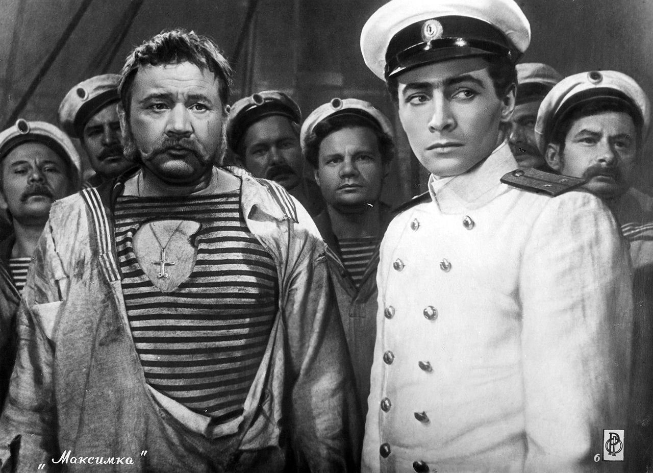 Борис Андреев в роли матроса Лучкина и Вячеслав Тихонов в роли лейтенанта Александра Горелова в фильме «Максимка». Реж. Владимир Браун. 1952