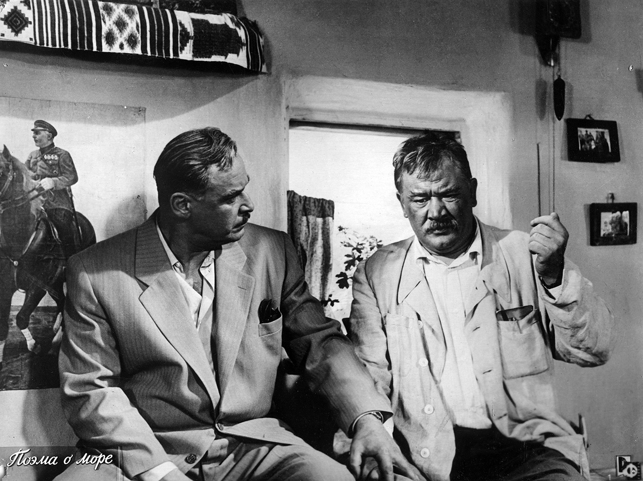Борис Ливанов в роли генерала Игната Федорченко и Борис Андреев в роли председателя колхоза Саввы Зарудного в фильме «Поэма о море». Реж. Юлия Солнцева. 1958