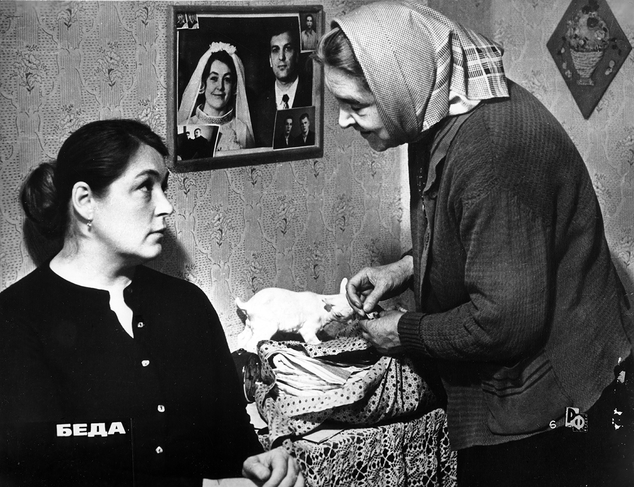 Лидия Федосеева-Шукшина в роли Зины, жены Кулигина и Елена Кузьмина в роли Евдокии Ивановны, матери Кулигина. Кадр из фильма «Беда». Реж. Динара Асанова. 1977