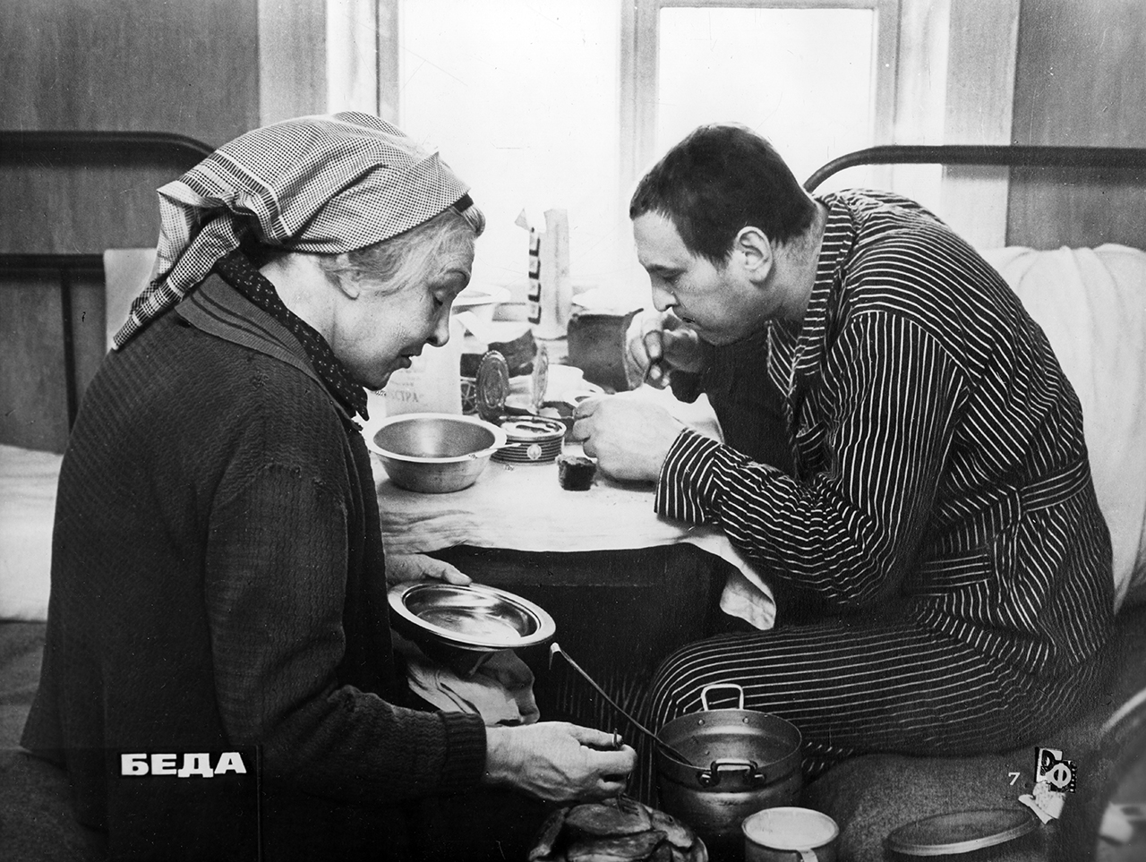 Елена Кузьмина в роли Евдокии Ивановны, матери Кулигина и Алексей Петренко в роли Славы Кулигина. Кадр из фильма «Беда». Реж. Динара Асанова. 1977