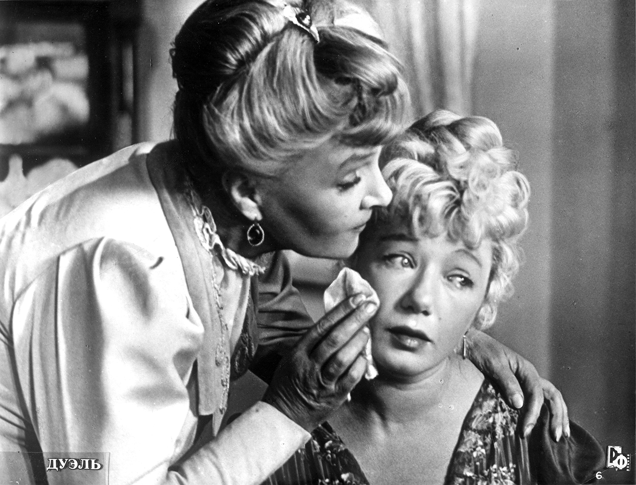Елена Кузьмина в роли Марьи Константиновны и Людмила Шагалова в роли Надежды Федоровны. Кадр из фильма «Дуэль». Реж. Татьяна Березанцева и Лев Рудник. 1961