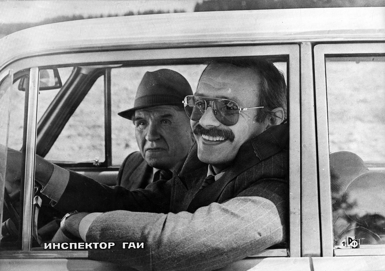 Николай Парфенов в роли Василия Пушкова и Никита Михалков в роли Валентина Трунова в фильме «Инспектор ГАИ». Реж. Эльдар Рязанов. Реж. Эльдор Уразбаев. 1982