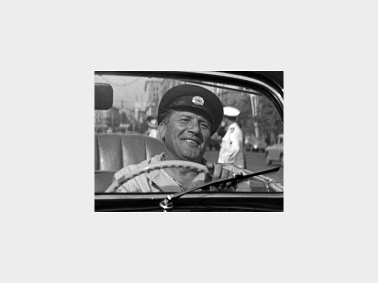 Николай Крючков в роли таксиста в фильме «Удивительное воскресенье» (V šest ráno na letišti). Реж. Ченек Дуба. 1957