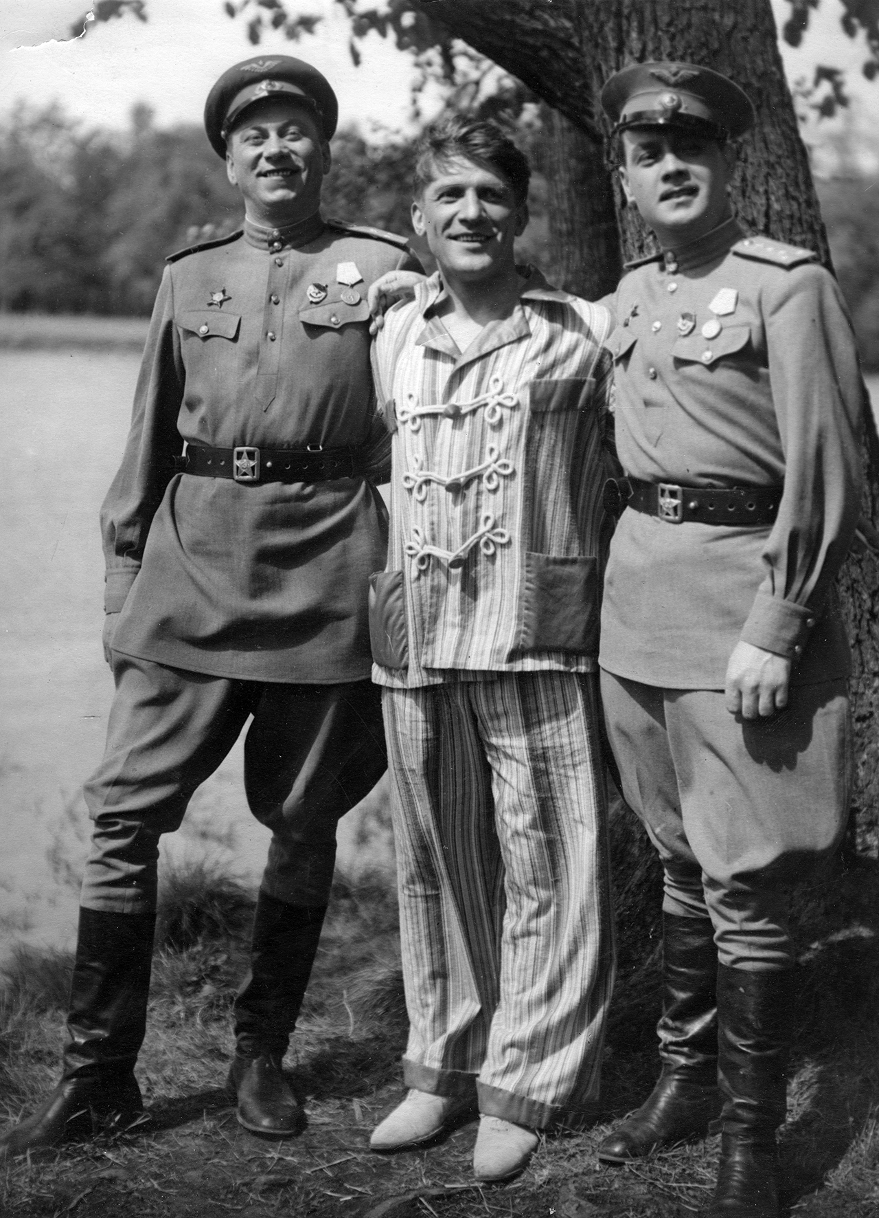 Василий Меркурьев в роли лейтенанта Тучи, Николай Крючков в роли майора Булочкина и Василий Нещипленко в роли капитана Кайсарова в фильме «Небесный тихоход». Реж. Семен Тимошенко. 1945