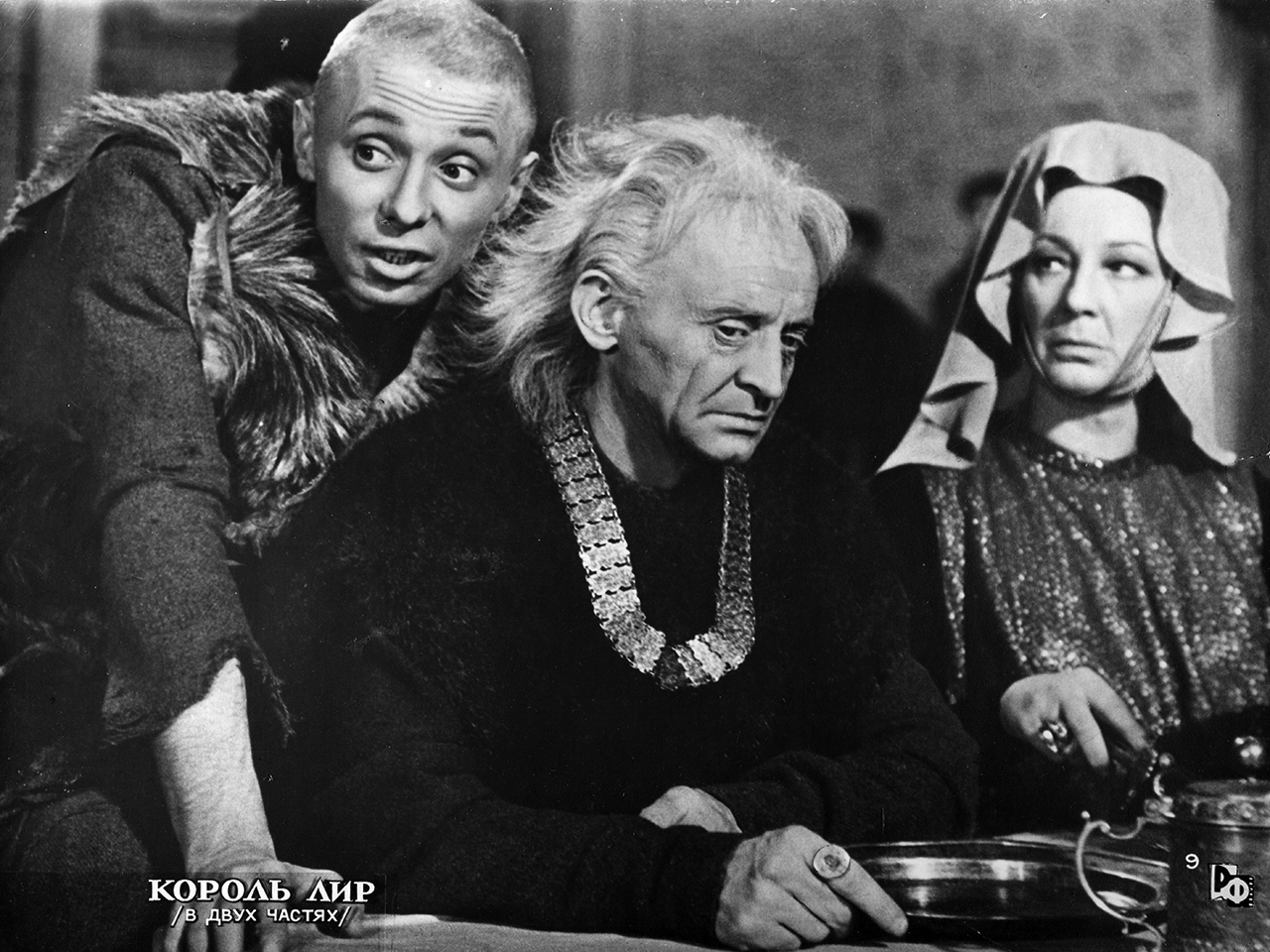 Олег Даль в роли Шута, Юри Ярвет в роли короля Лира и Эльза Радзиня в роли Гонерильи в фильме «Король Лир». Реж. Григорий Козинцев. 1970