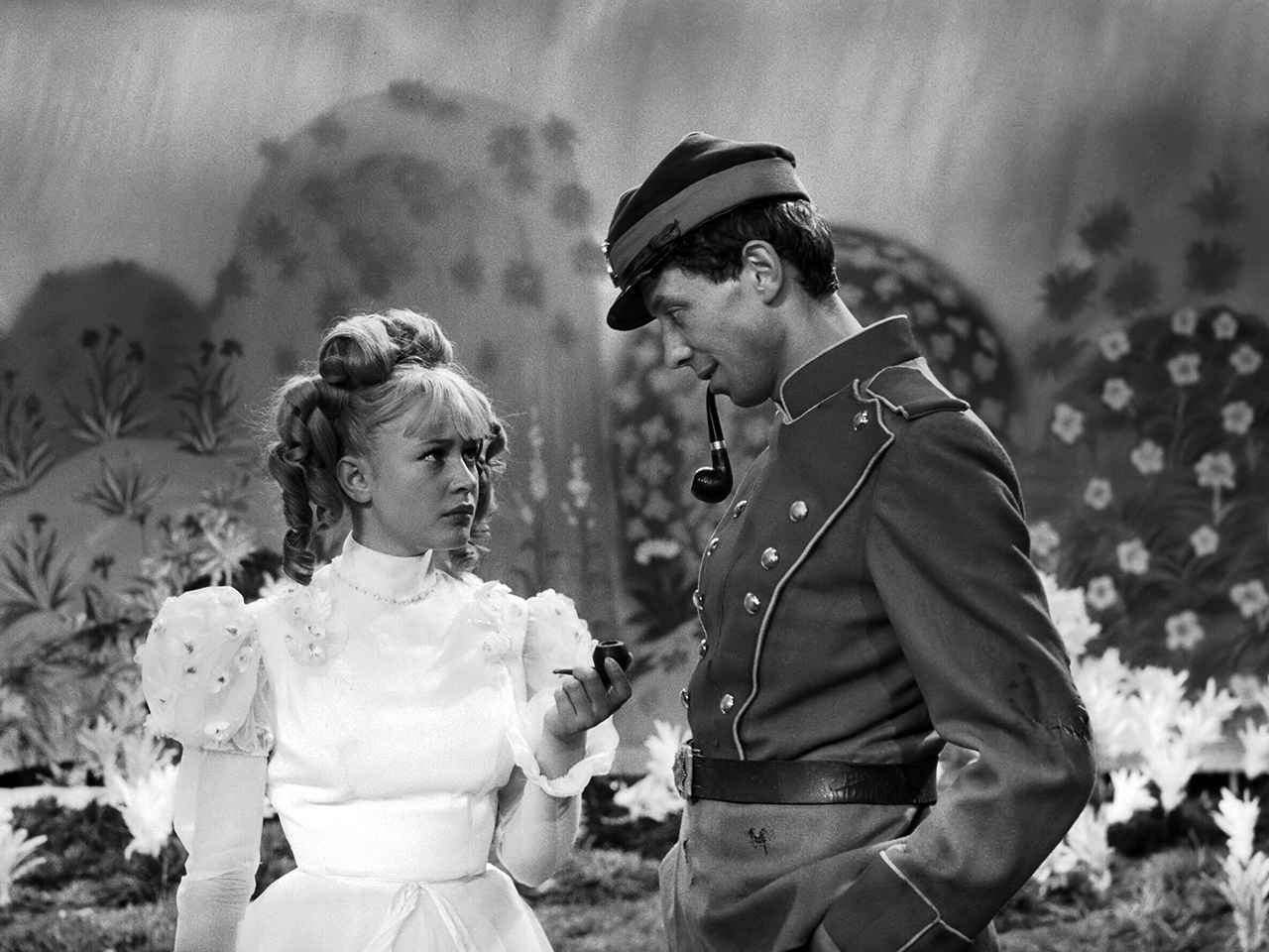 Марина Неелова в роли Дочери трактирщика и Принцессы и Олег Даль в роли Солдата и Сказочника в фильме «Старая, старая сказка». Реж. Надежда Кошеверова. 1968