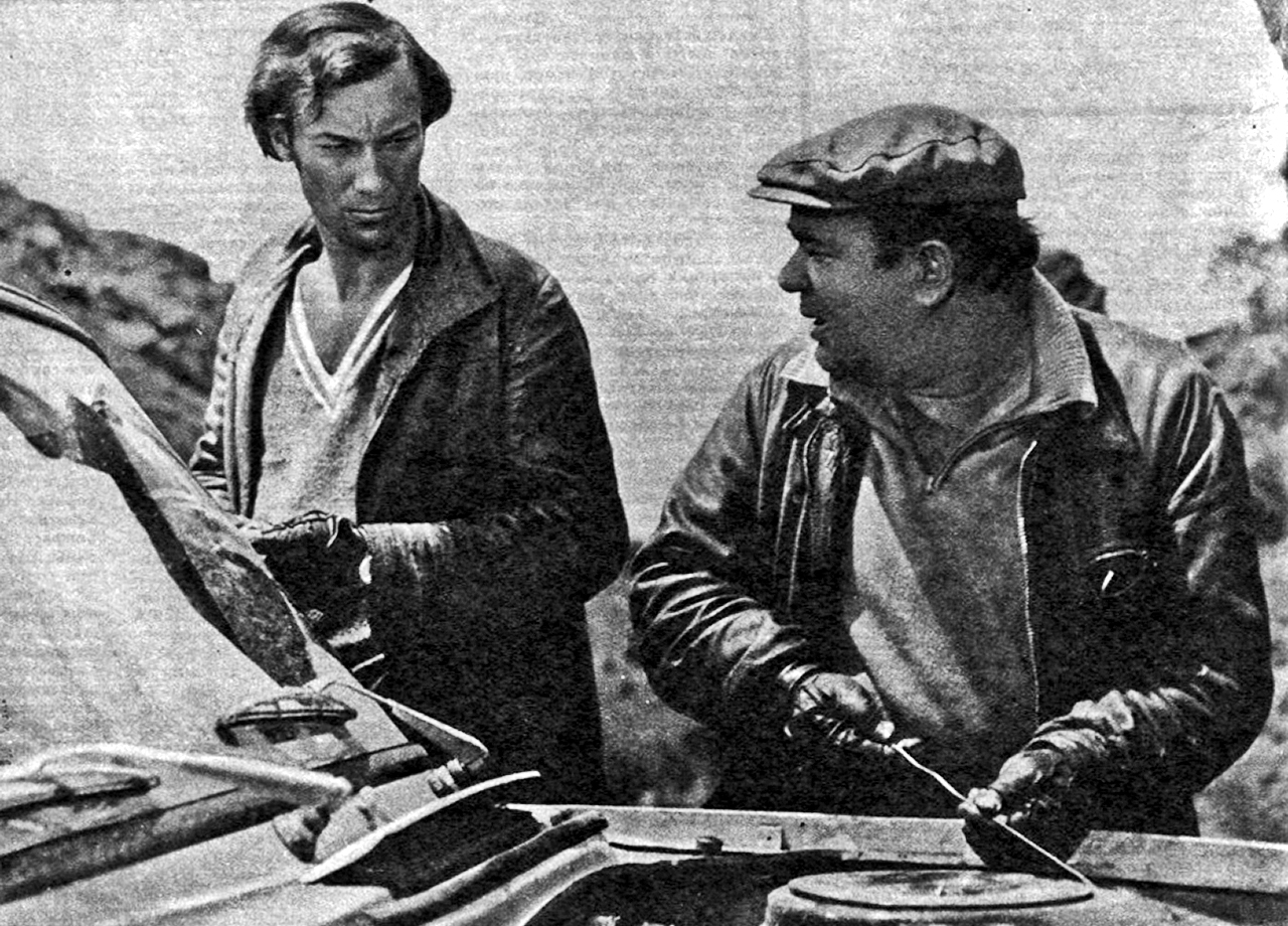 Олег Янковский в роли Николая Сергачева и Евгений Леонов в роли Ивана Кукушкина в фильме «Гонщики». Реж. Игорь Масленников. 1972