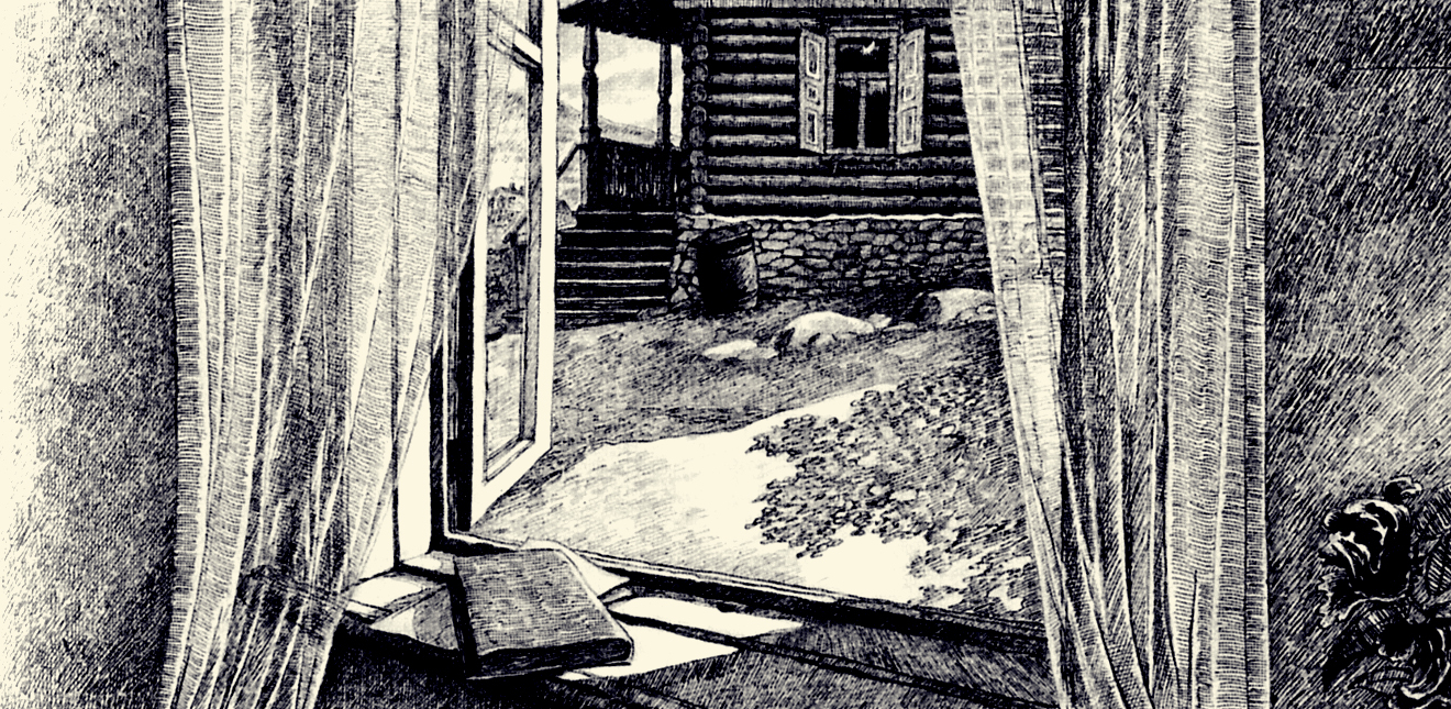 Эскиз декораций к фильму «Журналист» (1966). Вид на деревенский двор. Бумага, карандаш графитный, тушь, перо. Киноведческие записки. 2011/2012. № 99.