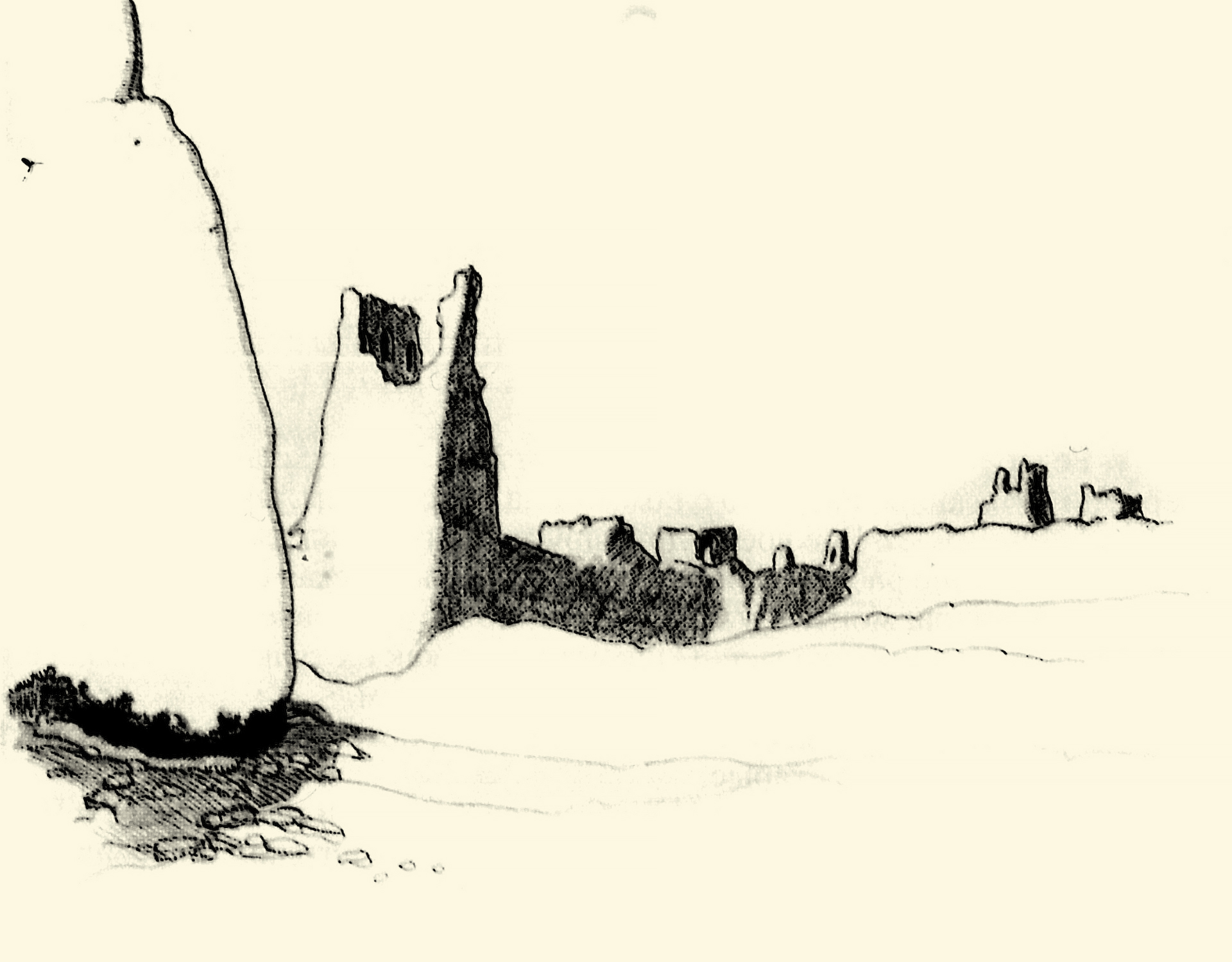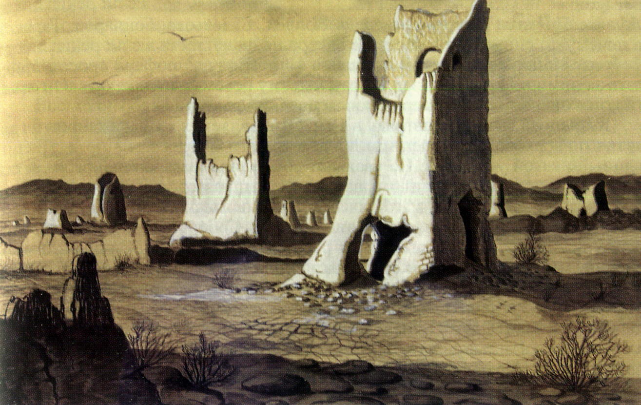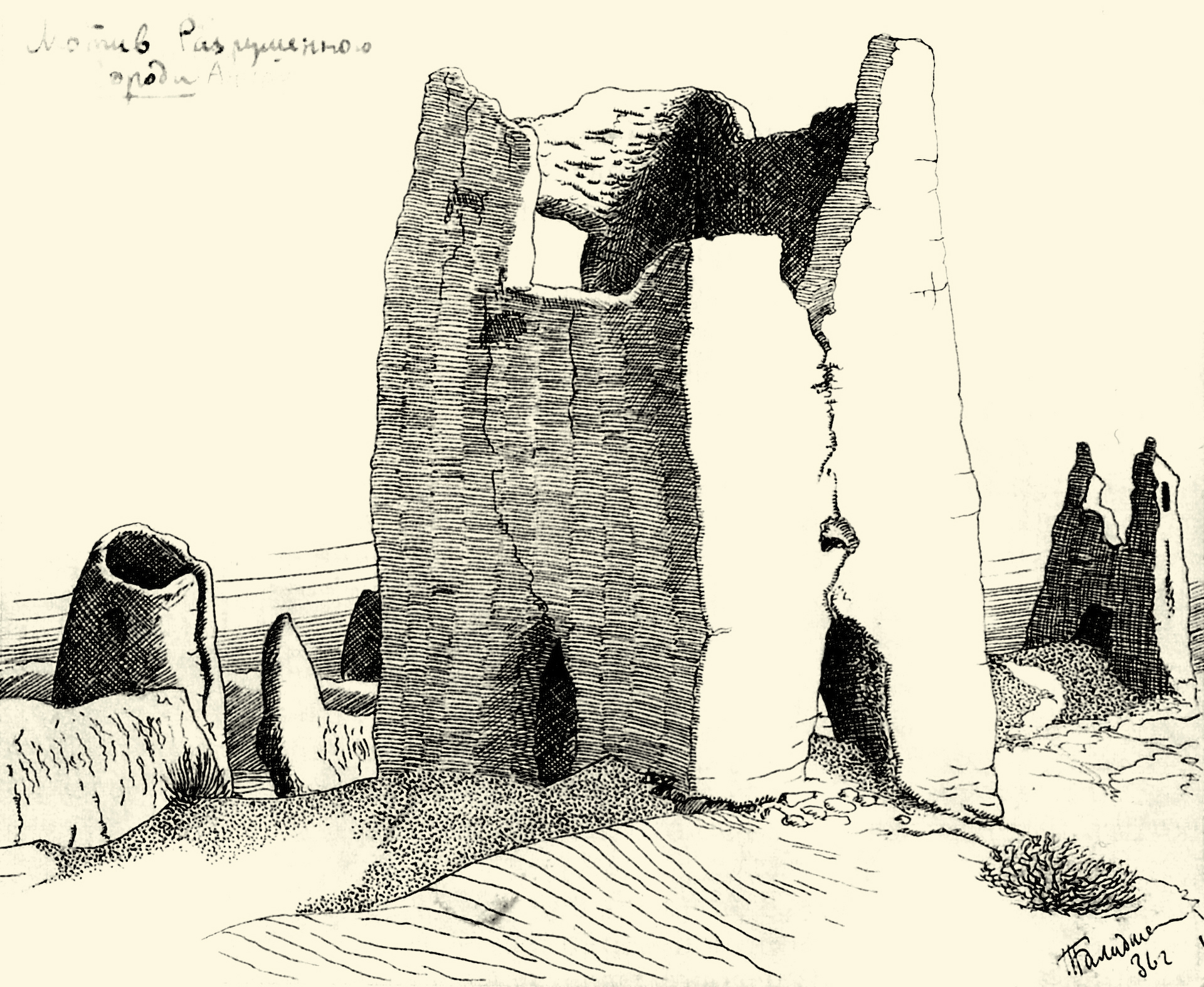 Эскиз декораций к фильму «Тринадцать» (1936). Разрушенный город Анау. Бумага, карандаш графитный, тушь, перо. Киноведческие записки. 2011/2012. № 99.