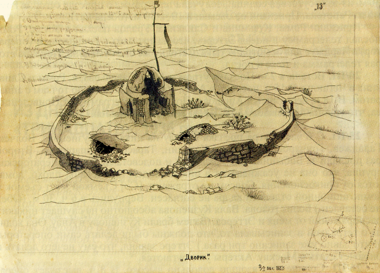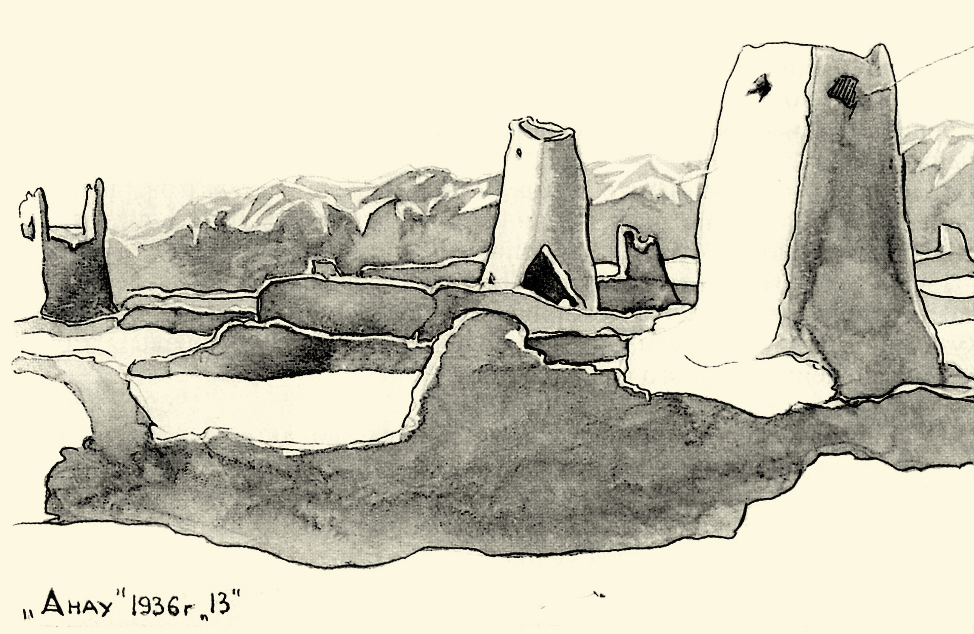 Эскиз декораций к фильму «Тринадцать» (1936). Разрушенный Анау. Бумага, карандаш графитный, тушь, перо. Киноведческие записки. 2011/2012. № 99.