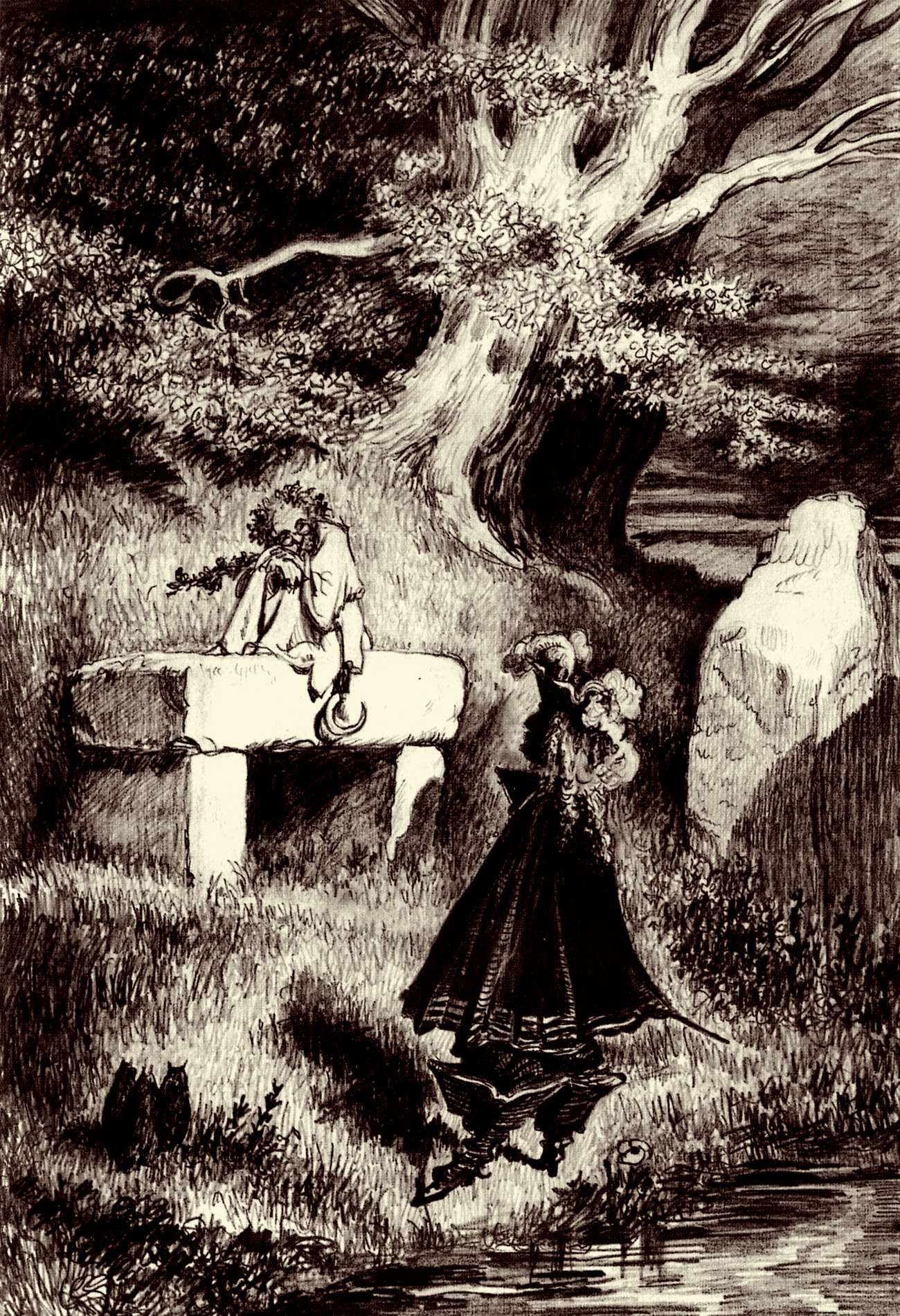 Эскиз к фильму «Новые похождения Кота в сапогах» (1957). На берегу озера. Бумага, карандаш графитный. Киноведческие записки. 2011/2012. № 99.