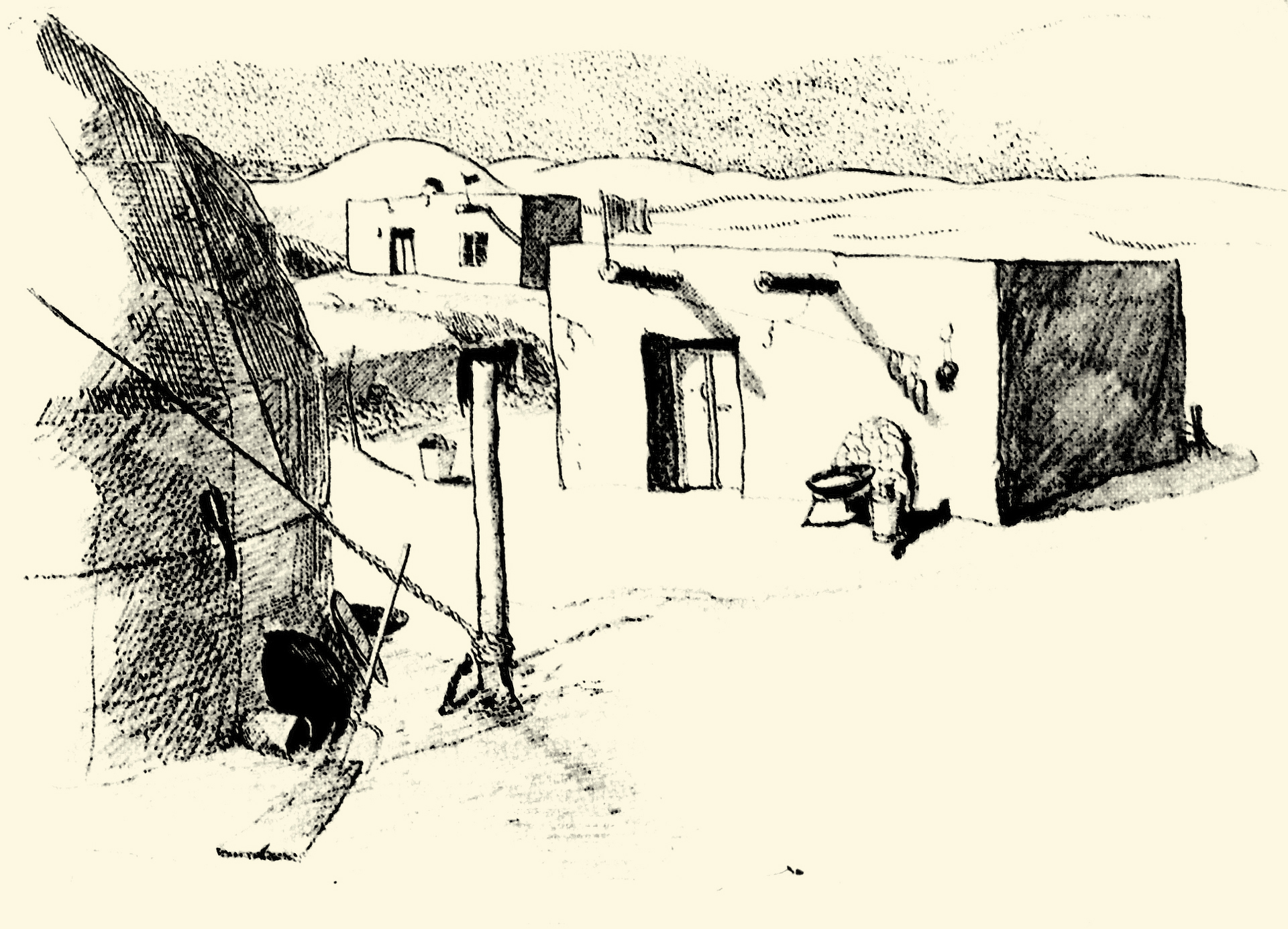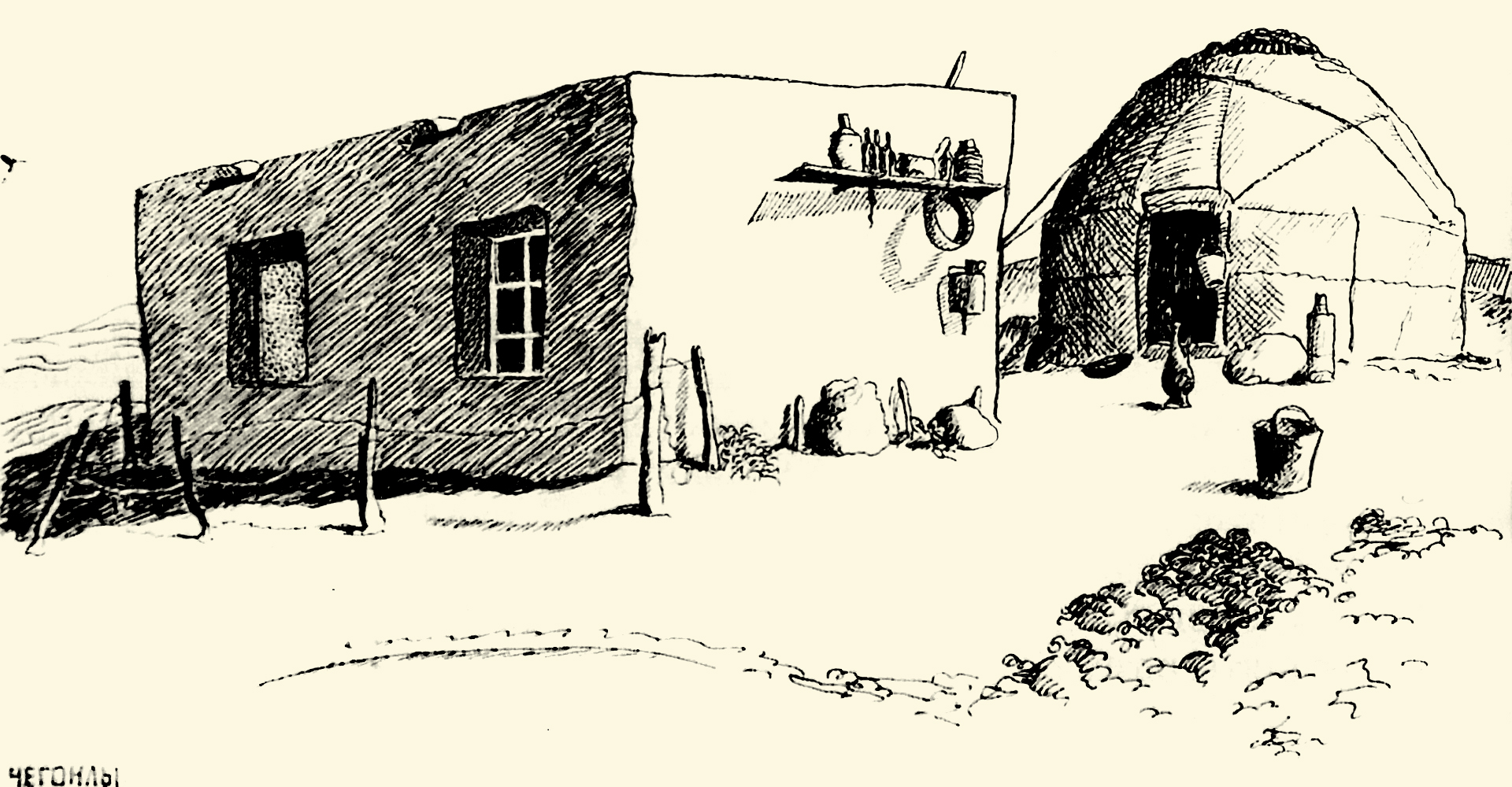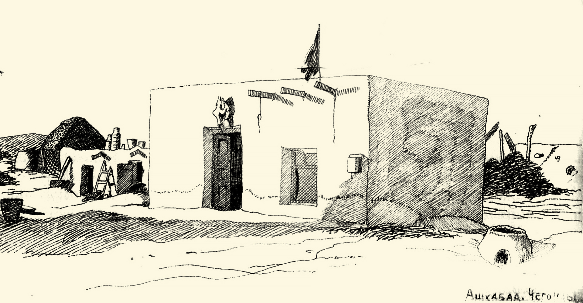 Эскиз декораций к фильму «Тринадцать» (1936). Ашхабад. Чеганлы. Бумага, карандаш графитный, тушь, перо. Киноведческие записки. 2011/2012. № 99.
