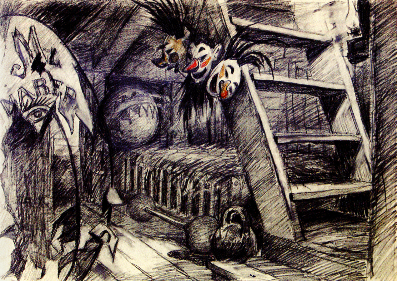 Эскизы декораций к фильму «Рыжик» (1960). Уборная циркового артиста. Бумага, карандаш графитный, пастель. Киноведческие записки. 2011/2012. № 99.