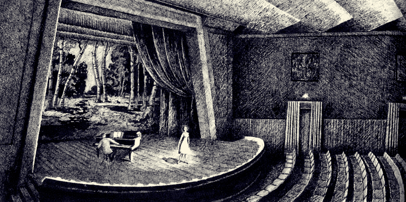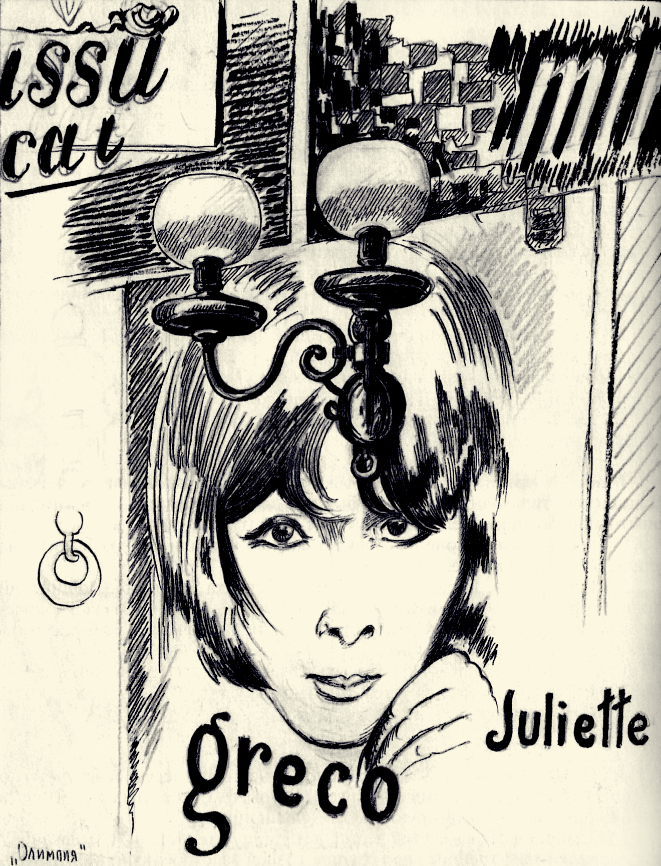 Эскиз декораций к фильму «Журналист» (1966). Выступление в клубе. Бумага, карандаш графитный, тушь, перо, белила. Киноведческие записки. 2011/2012. № 99.
