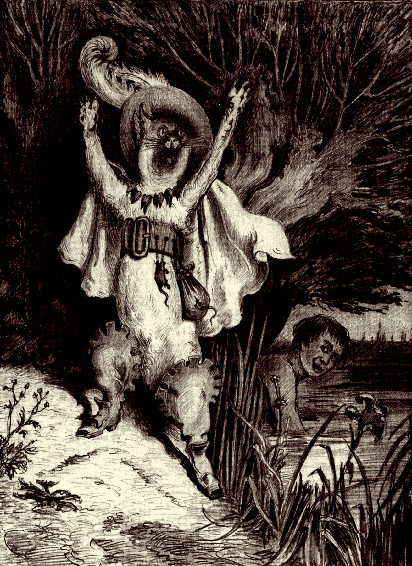 Эскиз к фильму «Новые похождения Кота в сапогах» (1957). Кот в сапогах. Бумага, карандаш графитный. Киноведческие записки. 2011/2012. № 99.