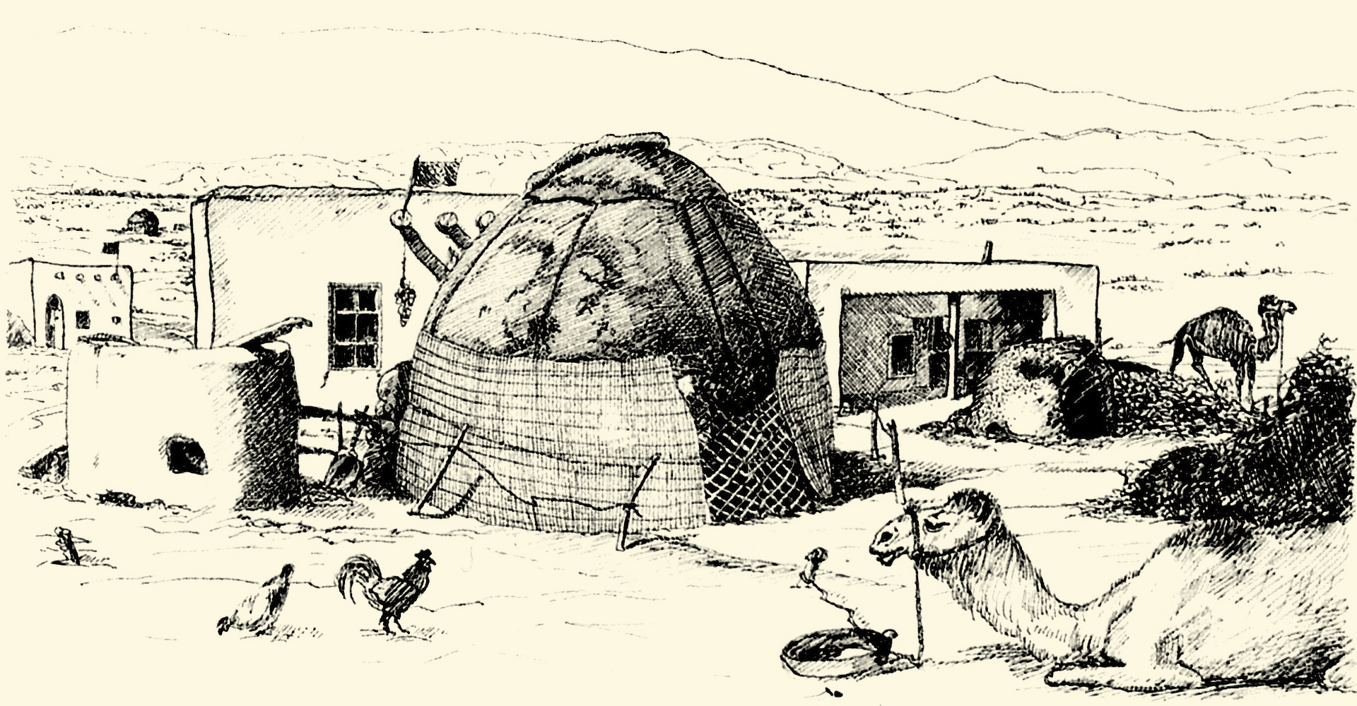 Эскиз декораций к фильму «Тринадцать» (1936). Анау. Бумага, карандаш графитный, тушь, перо. Киноведческие записки. 2011/2012. № 99.