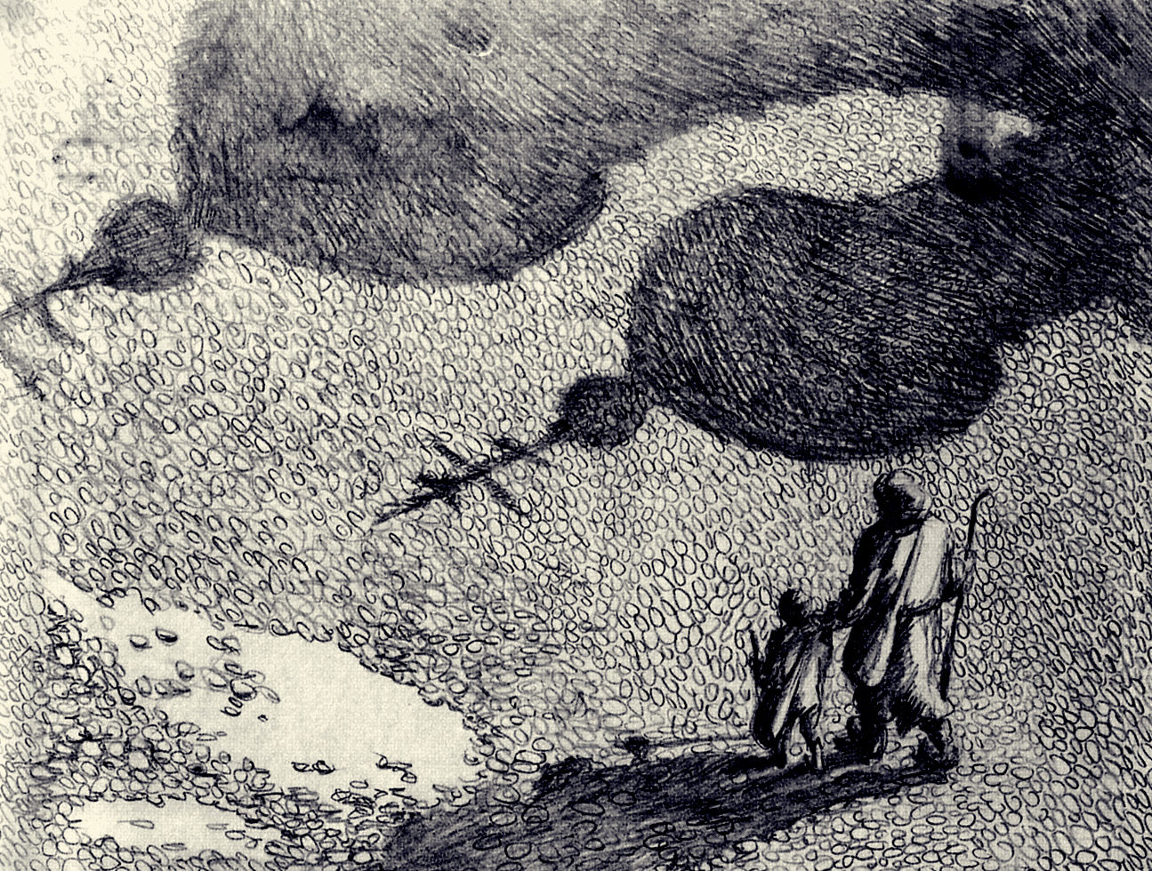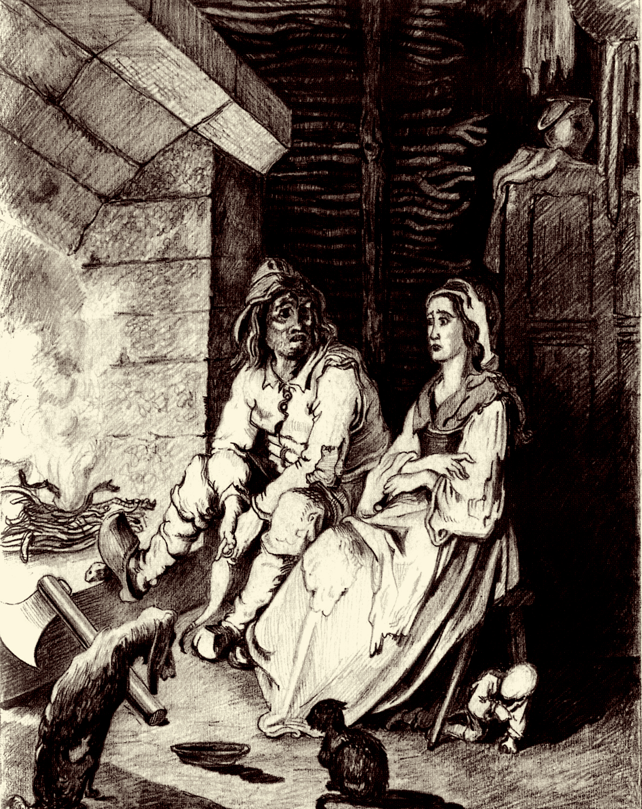 Эскиз к фильму «Новые похождения Кота в сапогах» (1957). Бедняки у камина. Бумага, карандаш графитный. Киноведческие записки. 2011/2012. № 99.