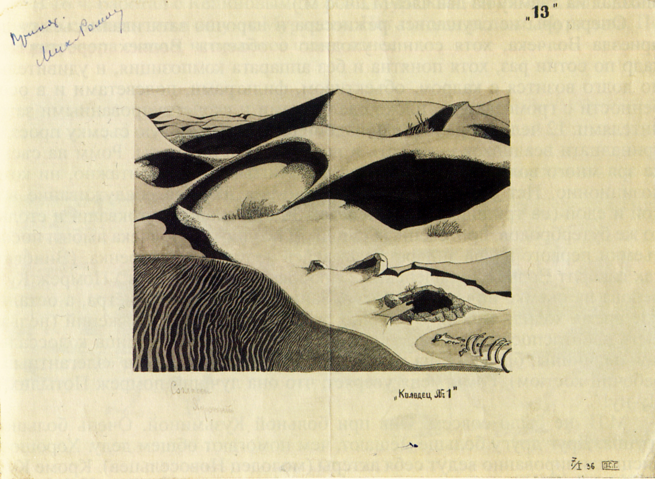 Эскиз декораций к фильму «Тринадцать» (1936). Барханы. Бумага, карандаш графитный, тушь, перо. Киноведческие записки. 2011/2012. № 99.
