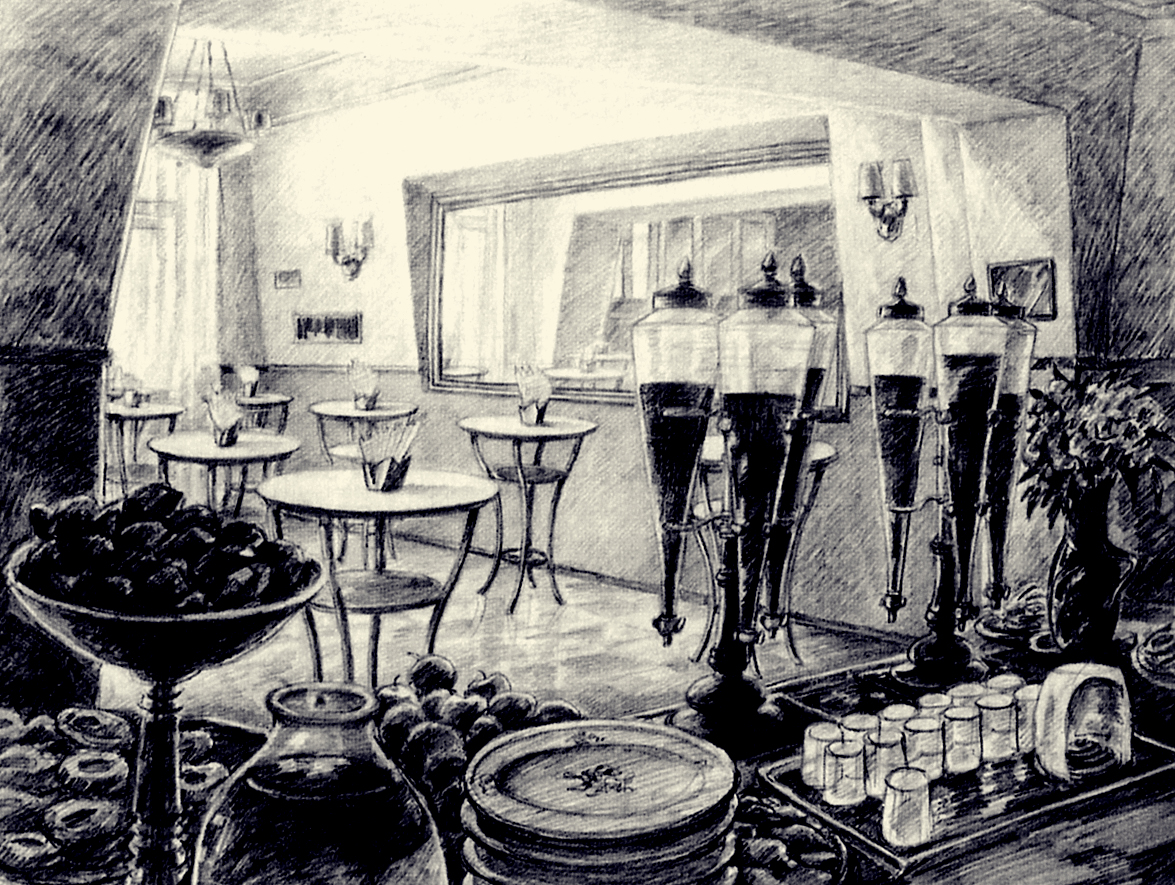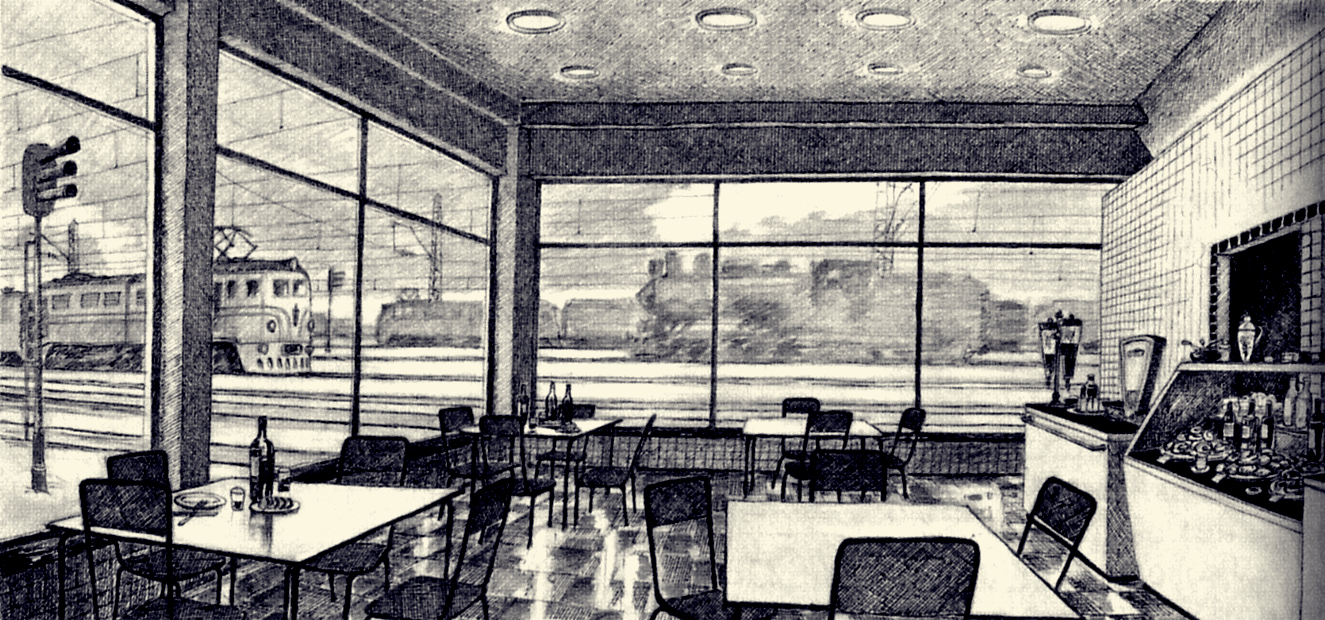 Эскиз декораций к фильму «Журналист» (1966). Вокзальный буфет. Бумага, карандаш графитный, тушь, перо. Киноведческие записки. 2011/2012. № 99.
