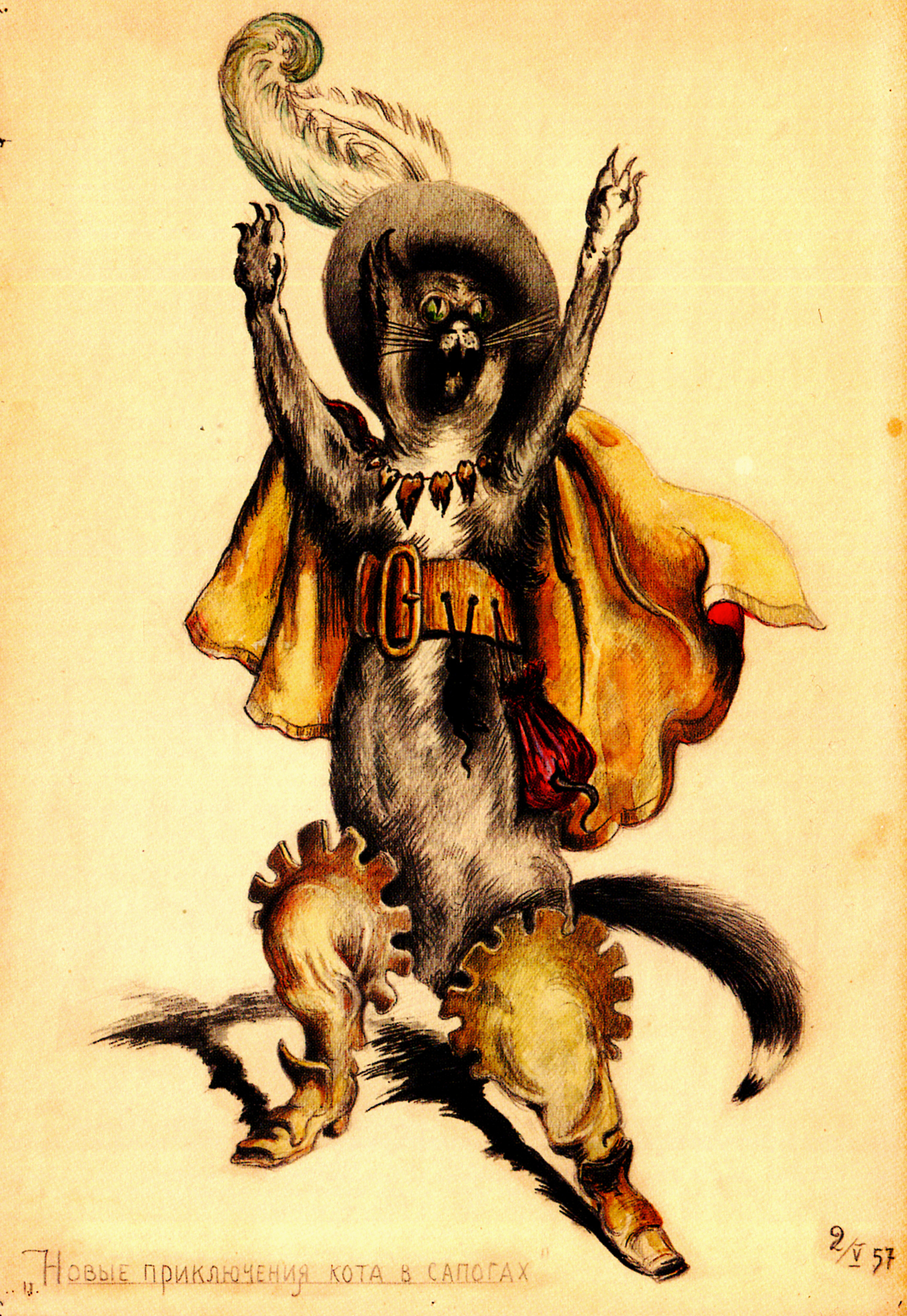 Эскиз к фильму «Новые похождения Кота в сапогах» (1957). Кот в сапогах. Бумага, карандаш графитный, гуашь, акварель. Киноведческие записки. 2011/2012. № 99.