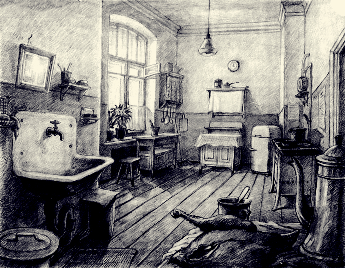 Эскизы декораций к фильму «Когда деревья были большими» (1961). Кухня в коммуналке. Бумага, карандаш графитный. Киноведческие записки. 2011/2012. № 99.