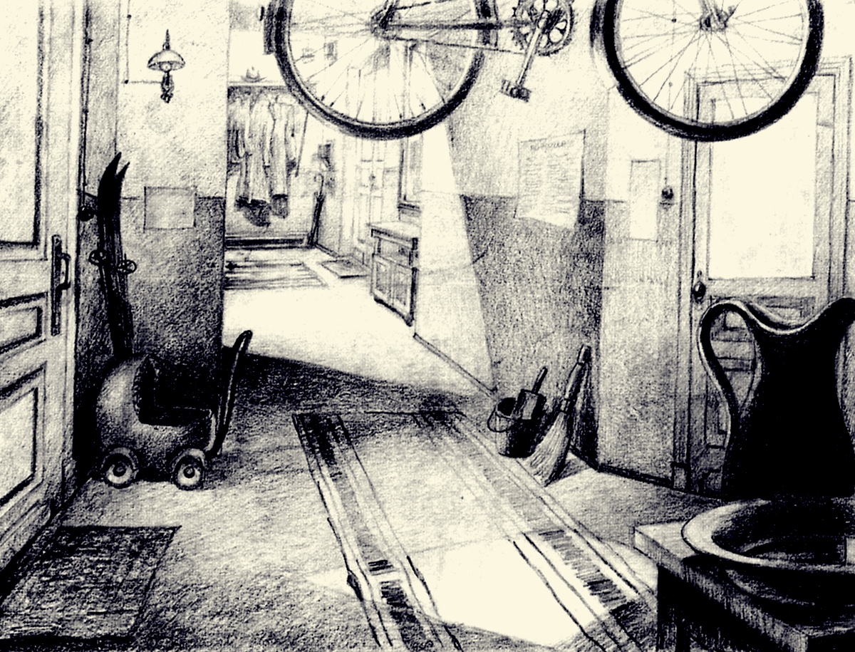 Эскизы декораций к фильму «Когда деревья были большими» (1961). Коридор в коммунальной квартире. Бумага, карандаш графитный. Киноведческие записки. 2011/2012. № 99.