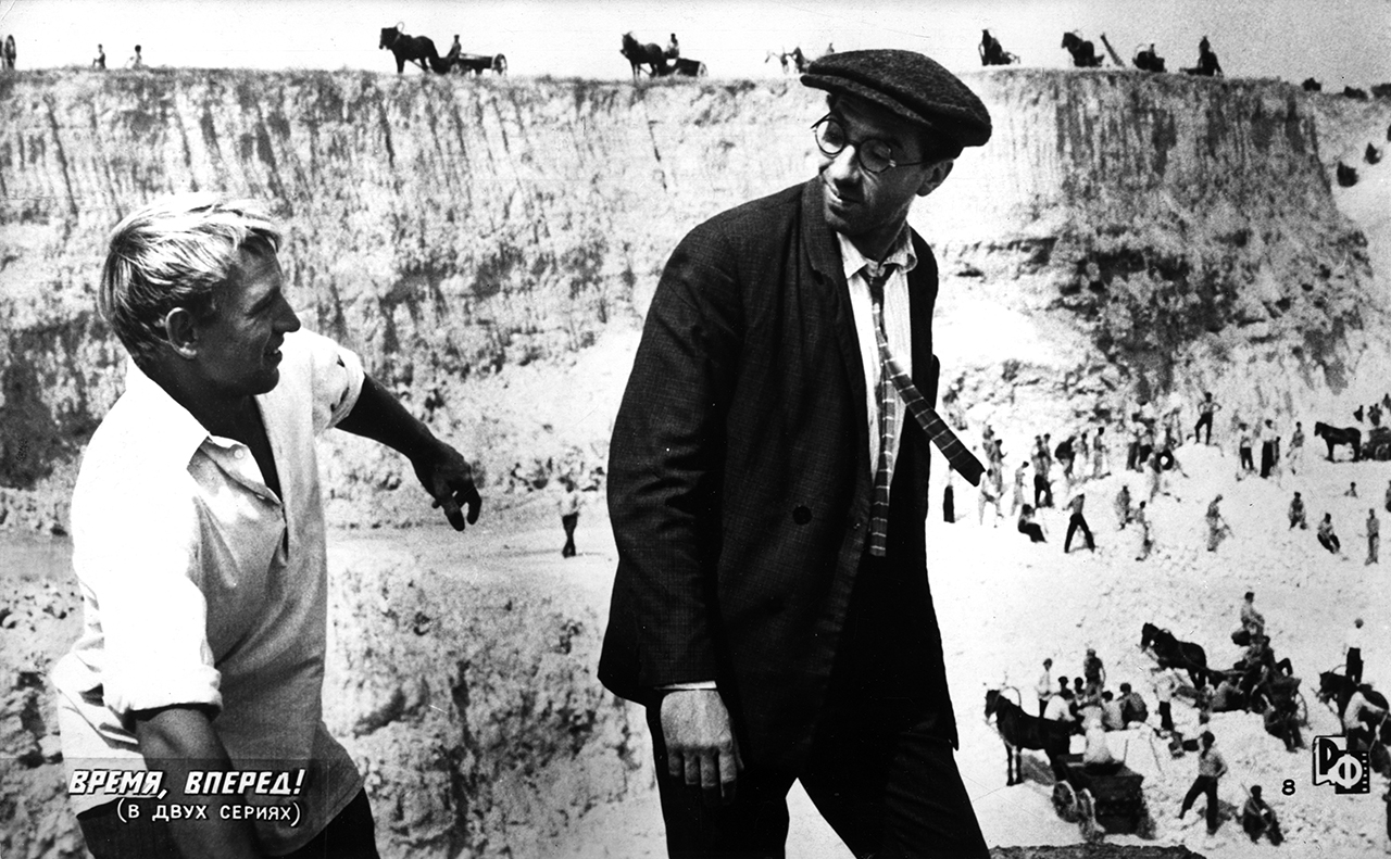 Николай Федорцов в роли рабочего Василия Сметаны и Сергей Юрский в роли начальника участка Давида Маргулиеса . Кадр из фильма «Время, вперед!». Реж. София Милькина и Михаил Швейцер. 1965