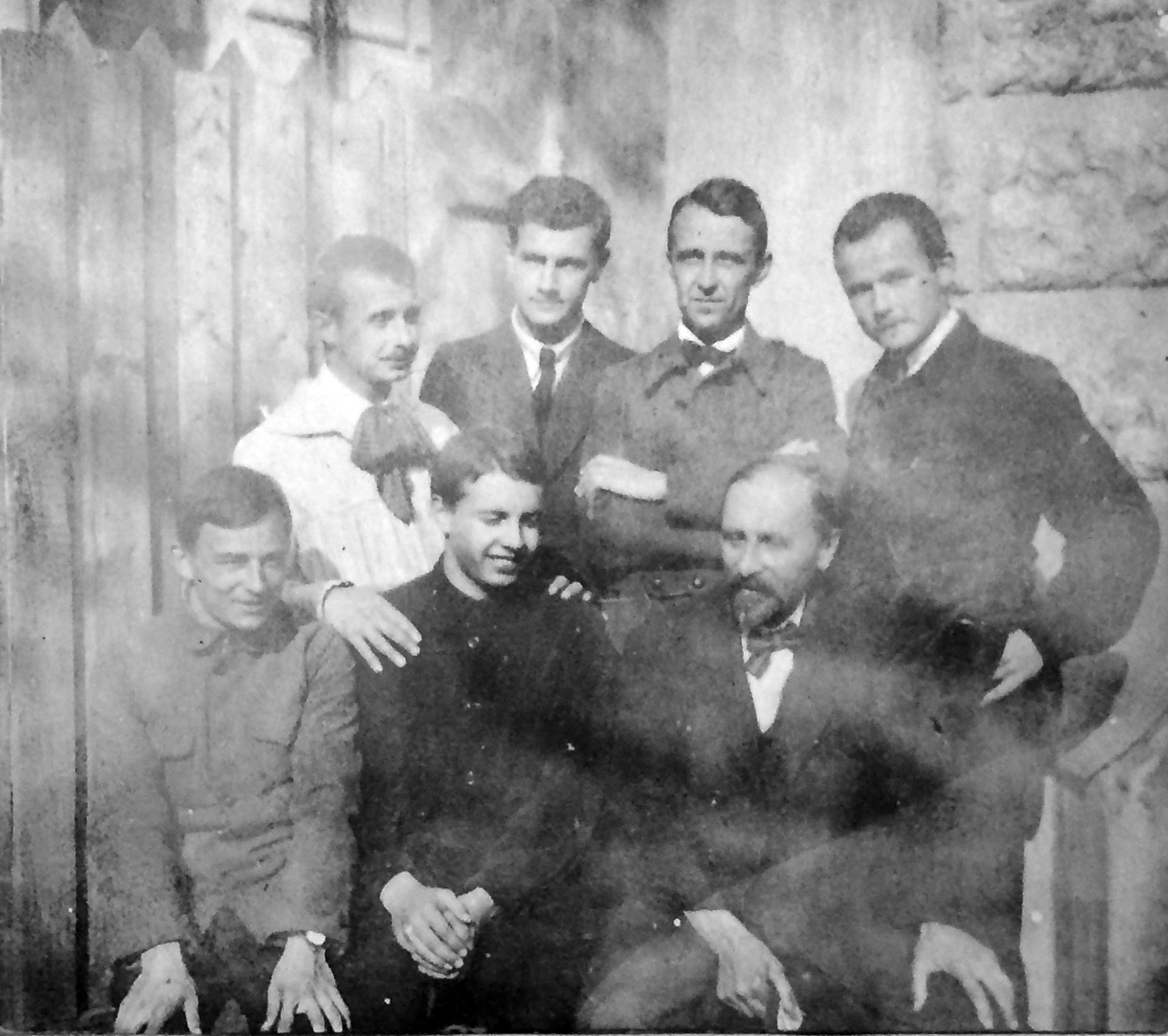 Виссарион Шебалин (сидит, первый слева) с профессором Катуаром и его учениками Обориным, Квадриным, Черемухиным, Никольским и Старохадомским. 1924 © РГАЛИ