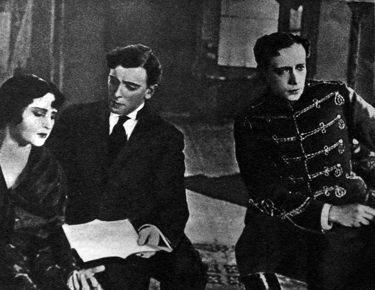 Вера Холодная в роли Лидии Ланиной, Витольд Полонский в роли Ланина и Владимир Максимов в роли князя Юрии Мещерского в фильме «У камина». Реж . Петр Чардынин. 1917