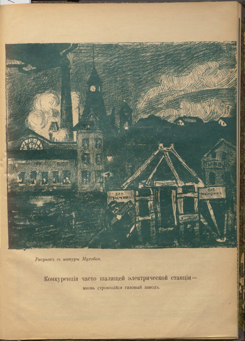 «Конкуренция часто шалящей электрической станции – вновь строящийся газовый завод». Иллюстрация В.Старевича из журнала «Ковенское зеркало».